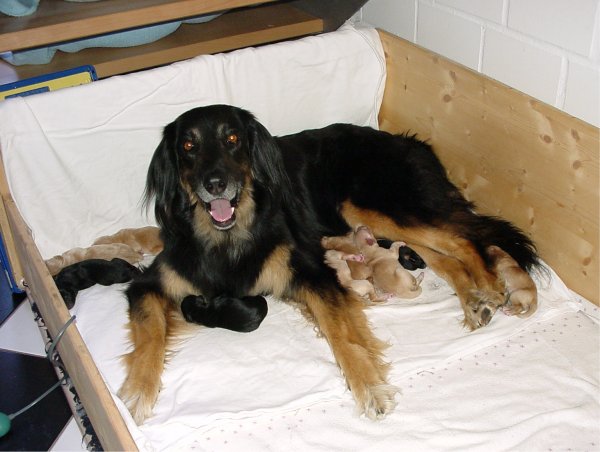 Wir freuen uns über sieben Rüden und zwei Hündinnen. Bloxi war nach der Geburt ziemlich fit und sorgt sich jetzt in der Wurfkiste um ihren Nachwuchs.