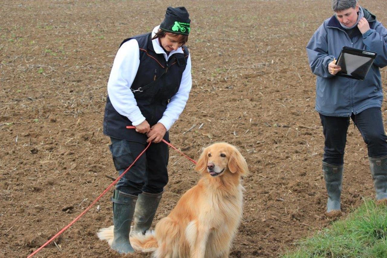 Am ersten Prüfungstag mussten wir als zweite Starter nicht lange auf unseren Einsatz warten. Das Gelände war heller Acker mit Senf als Bewuchs. Die Fährte war sehr lang (2.000 Schritte) und Bellis suchte sie intensiv ab.