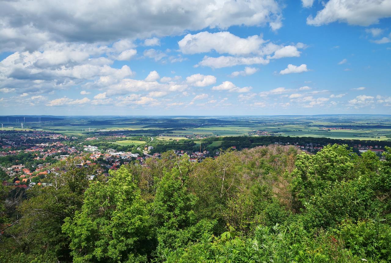 Blick vom großen Burgberg ins Harzvorland