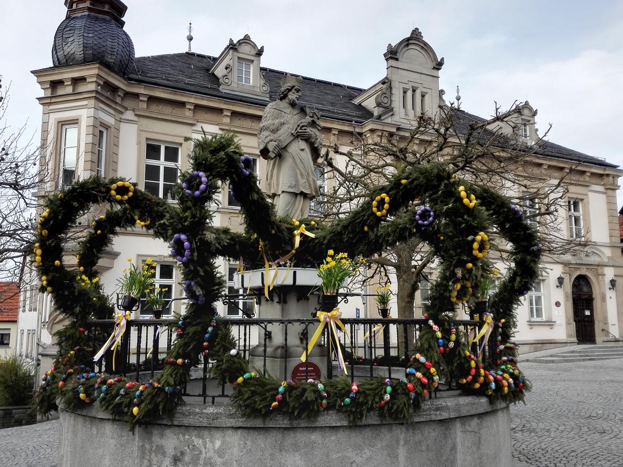 Österlich geschmückter Dorfbrunnen am Marktplatz