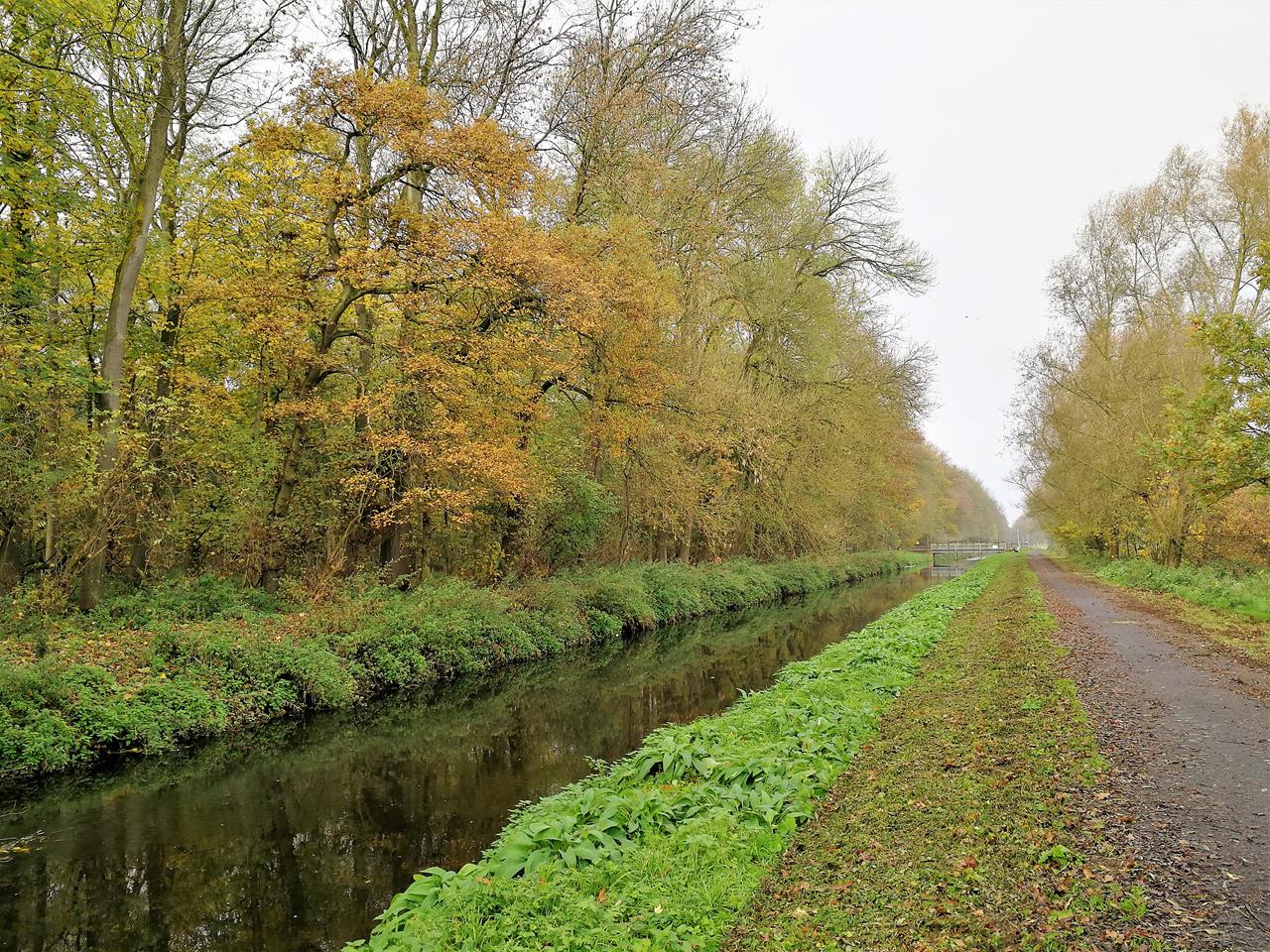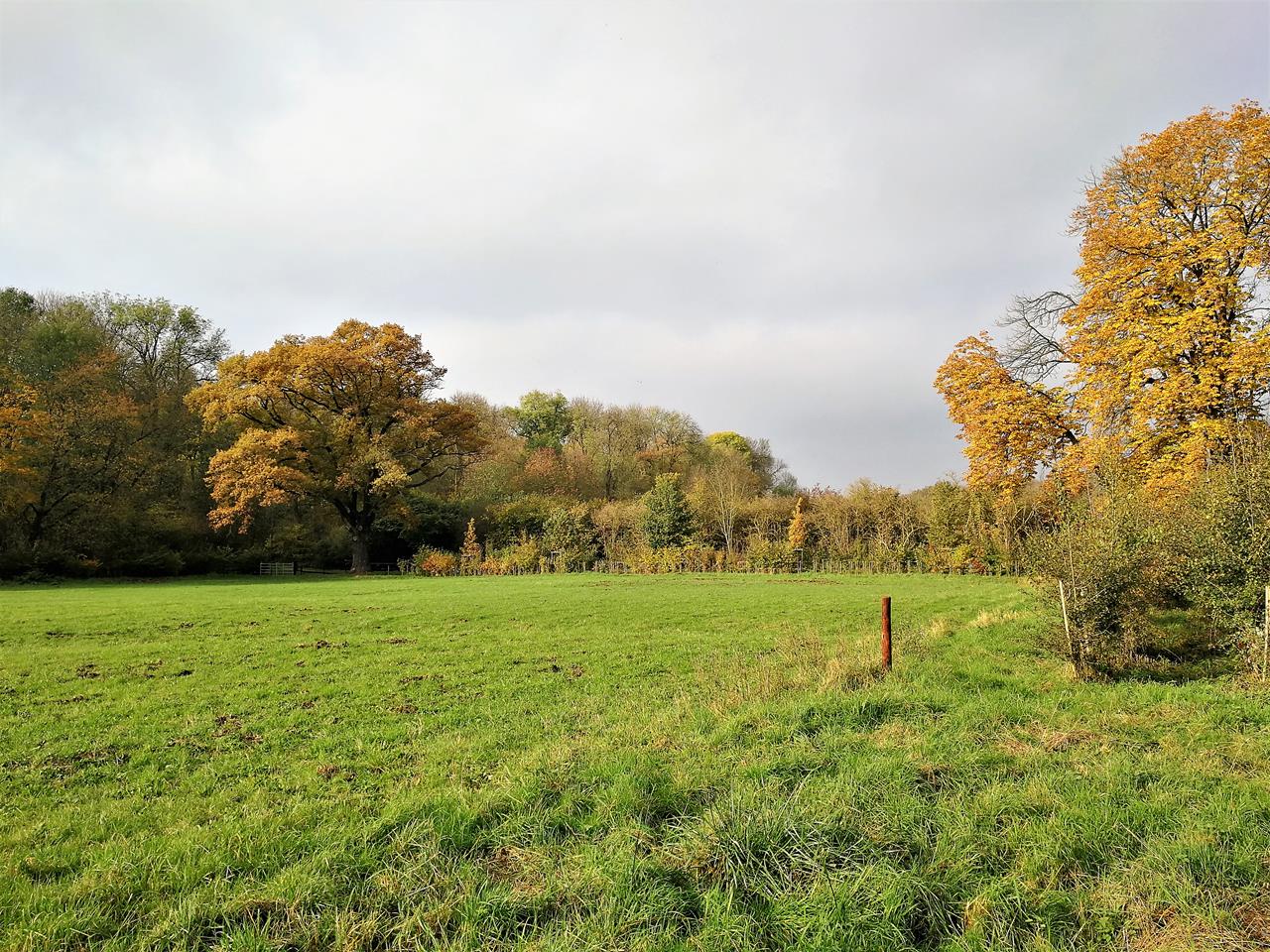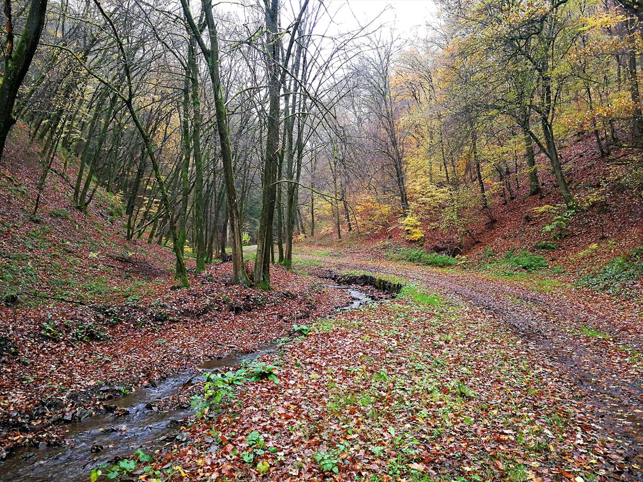 Hinter dem Ort laufen wir parallel zum Wodantal den Hang hinauf, bis wir die Kammhöhe des Hansbergs erreichen. Von dort haben wir einen schönen Blick in die herbstlich bunte Landschaft der Elfringhauser Schweiz.