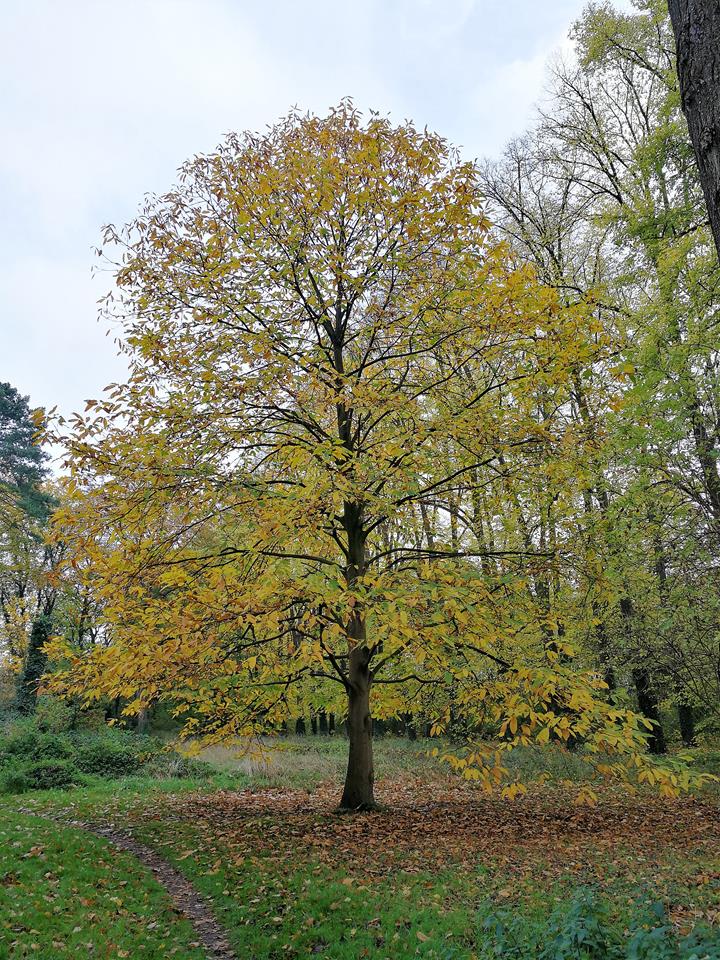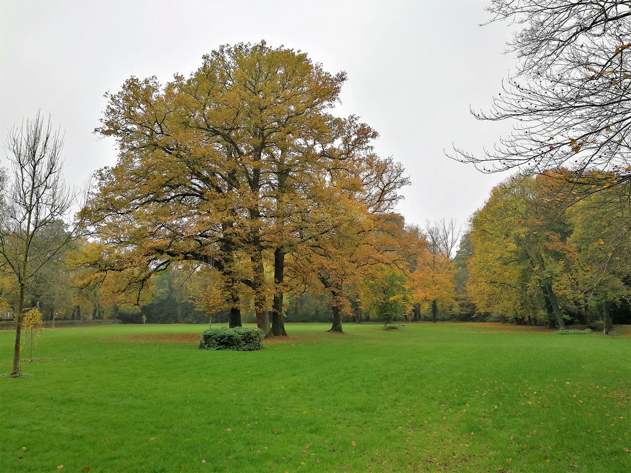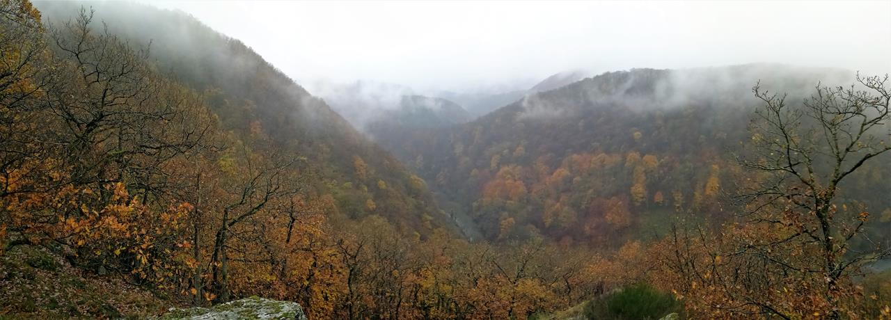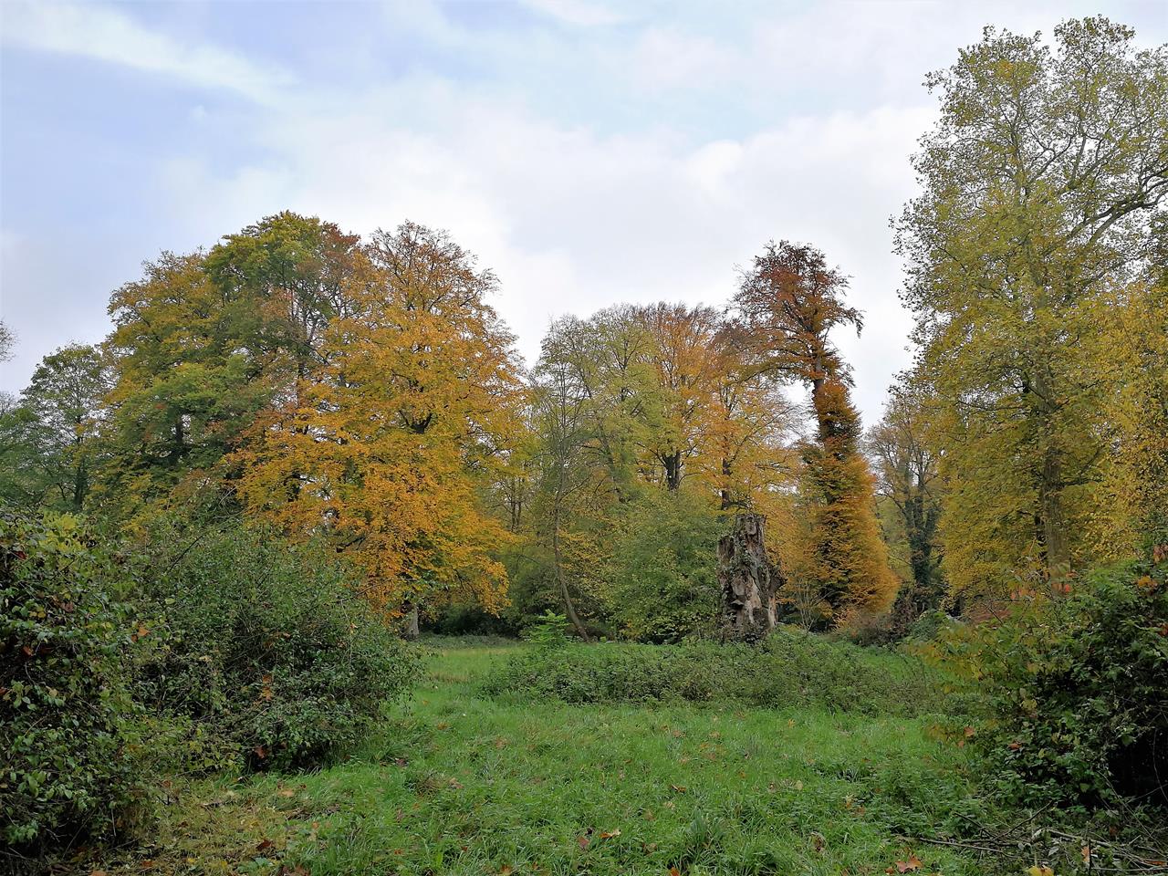 Hinter dem Ort laufen wir parallel zum Wodantal den Hang hinauf, bis wir die Kammhöhe des Hansbergs erreichen. Von dort haben wir einen schönen Blick in die herbstlich bunte Landschaft der Elfringhauser Schweiz.