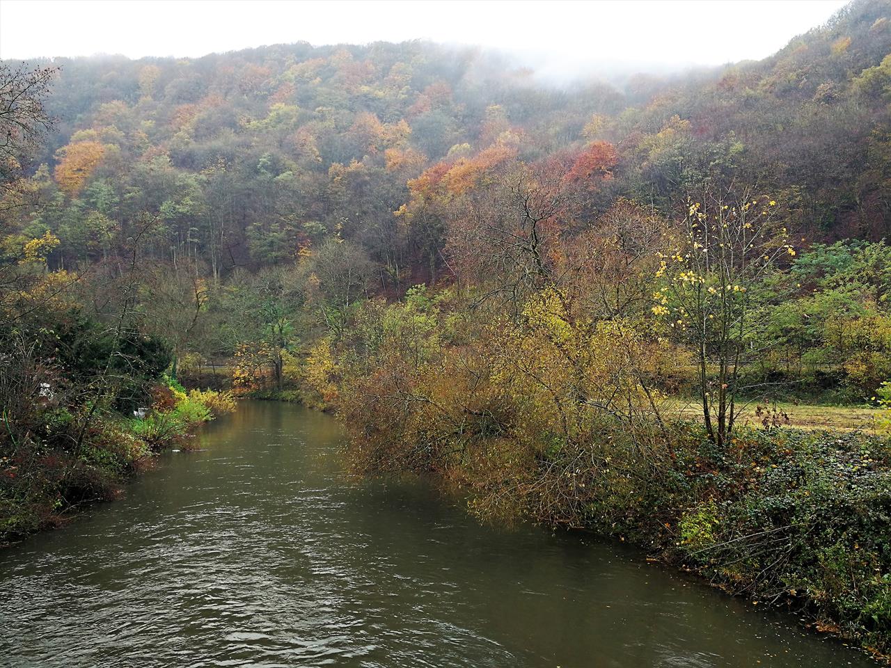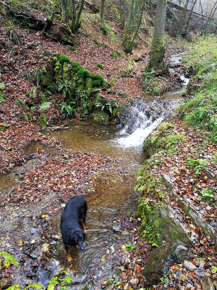Dann passieren wir die alte Birschel Mühle und kommen in einen naturbelassenen Flussabschnitt, wo Kühe auf den flussnahen Wiesen grasen. Eine kleine Gruppe von Wiederkäuern versperrt uns den Weg.