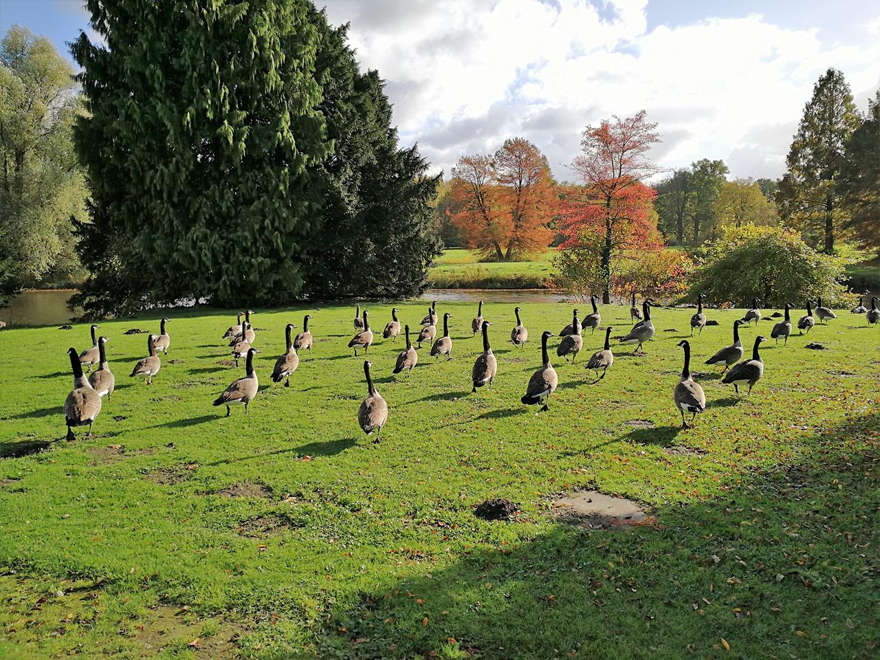 Kanadische Wildgänse auf den Wiesen rund um das Schloss