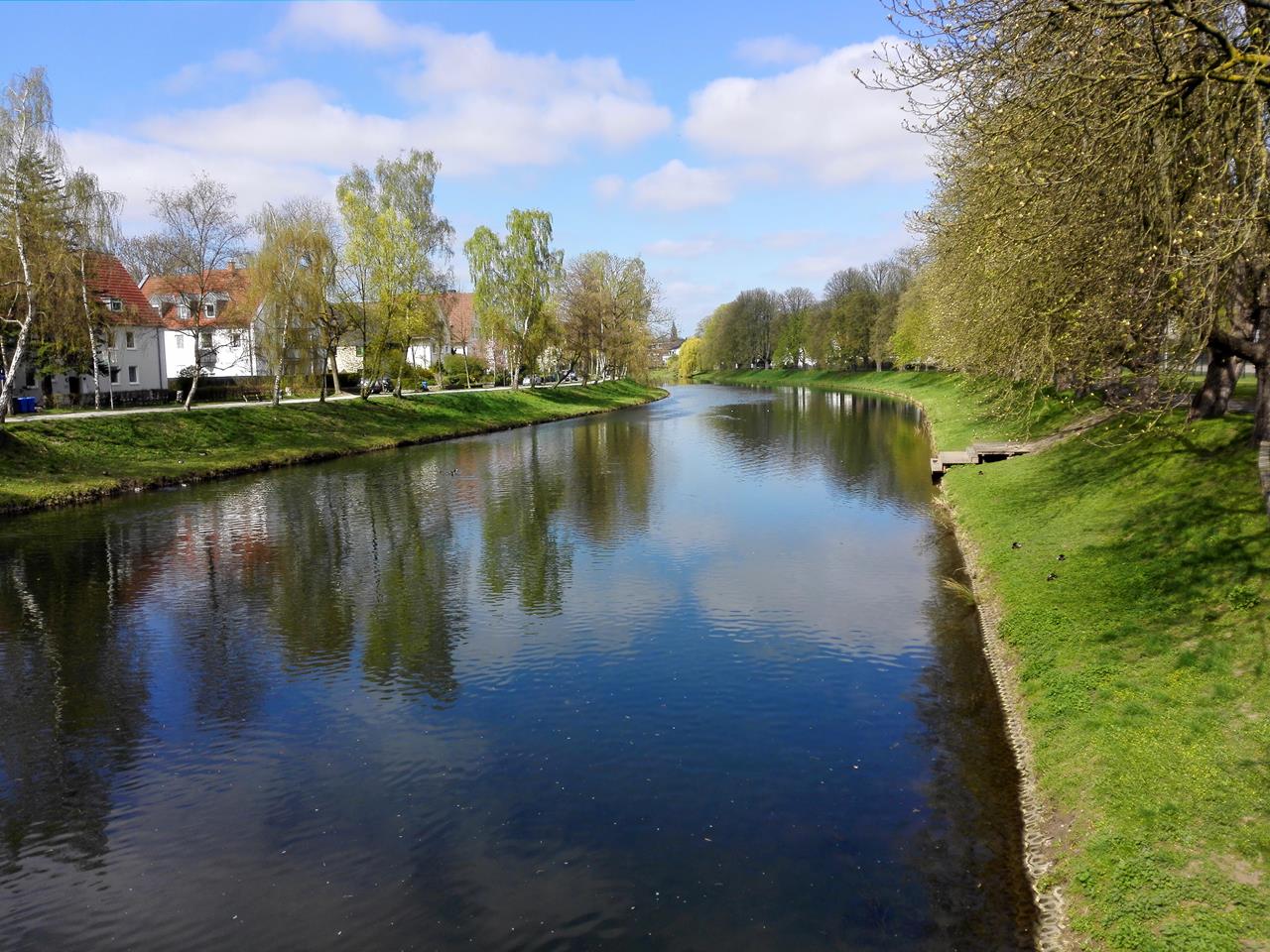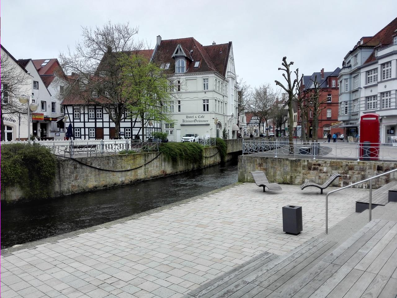 in die Aa. Mit Doxi laufe ich entlang der schönen Werre in das historische Zentrum der Stadt, das sich innerhalb der Wallanlagen befindet. Dazu gehören der frühere Abteibezirk („die Freiheit“), das älteste Stadtviertel Radewig, die Altstadt und die Neustadt.