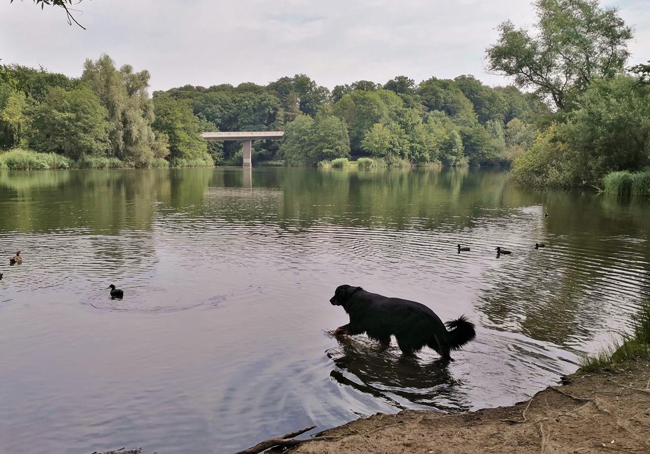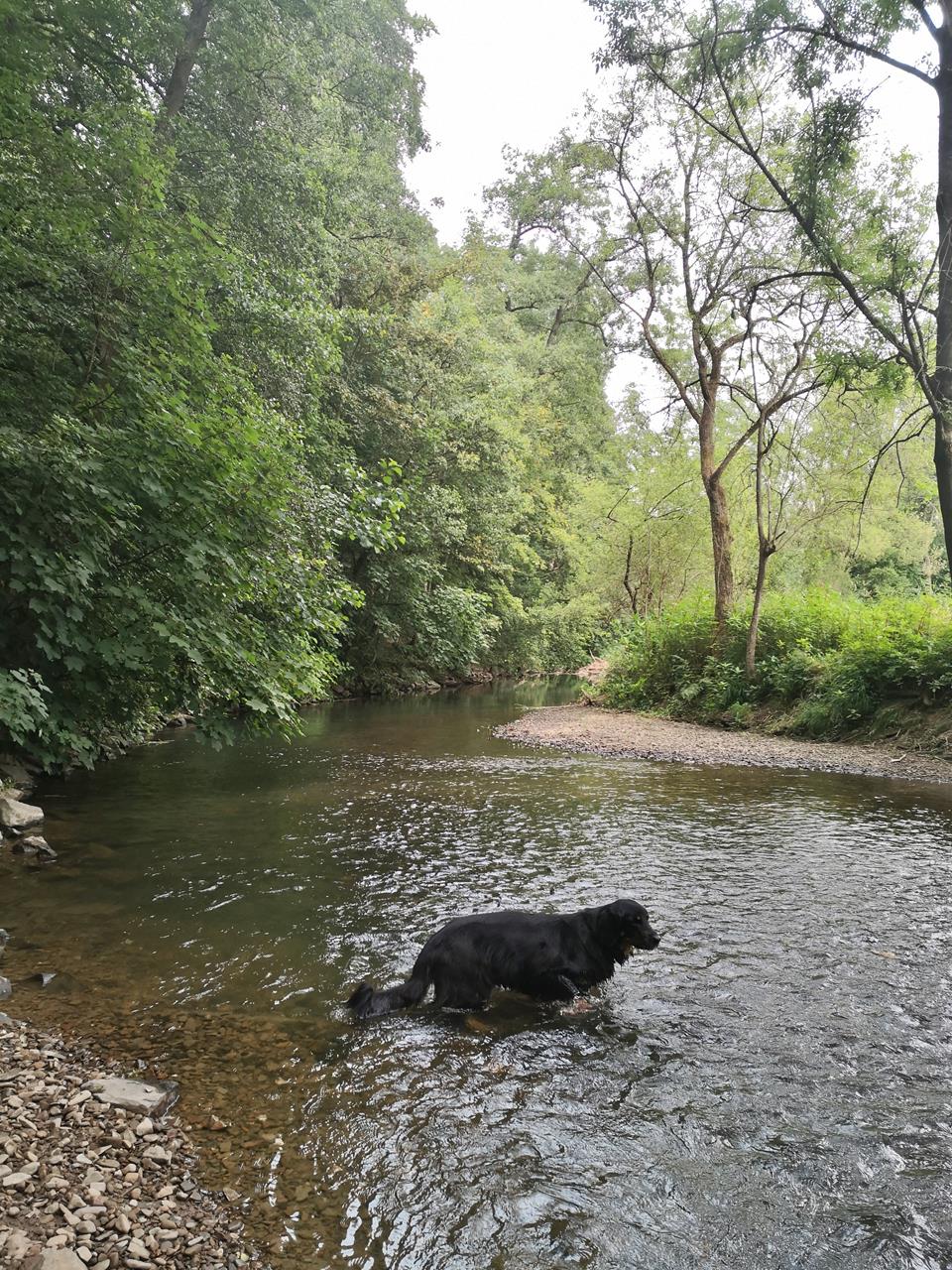Hinter dem Industriemuseum laufen wir weiter an der schönen Dhünn entlang. Doxi nutzt wiederholt die Gelegenheit, um sich im flachen Flussbett Abkühlung zu verschaffen.
