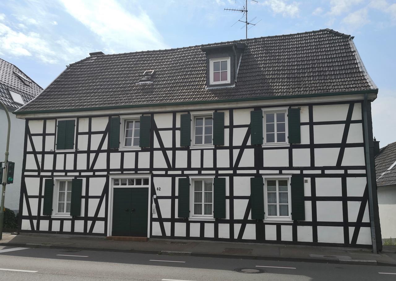 Durch den Grüngürtel einer Wohnsiedlung laufen wir weiter in Richtung des Ophovener Mühlenbachs, der am Zuckerberg im Ophovener Weiher aufgestaut wird.Wir durchlaufen die Kleingartensiedlung Mathildenhof und stehen bald vor der hübschen Johannes-von-Nepomuk-Kapelle von 1737 im Stadtteil Leverkusen Steinbüchel/Fettehenne.