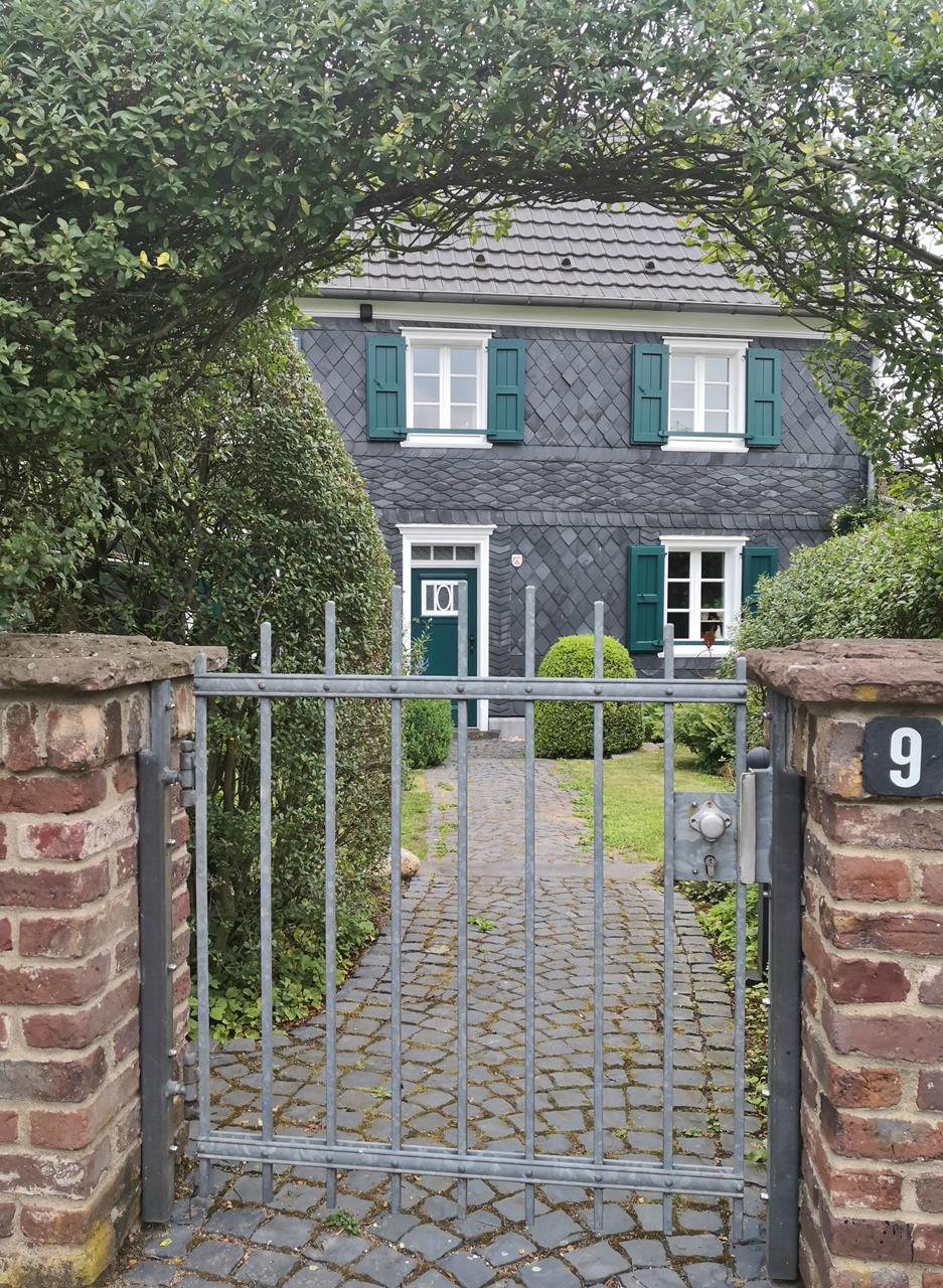Wir steigen durch den Wald auf bis zum Uppersberg. Von den Häusern dort hat man einen unglaublichen Panoramablick auf die Skyline von Köln und von Leverkusen.