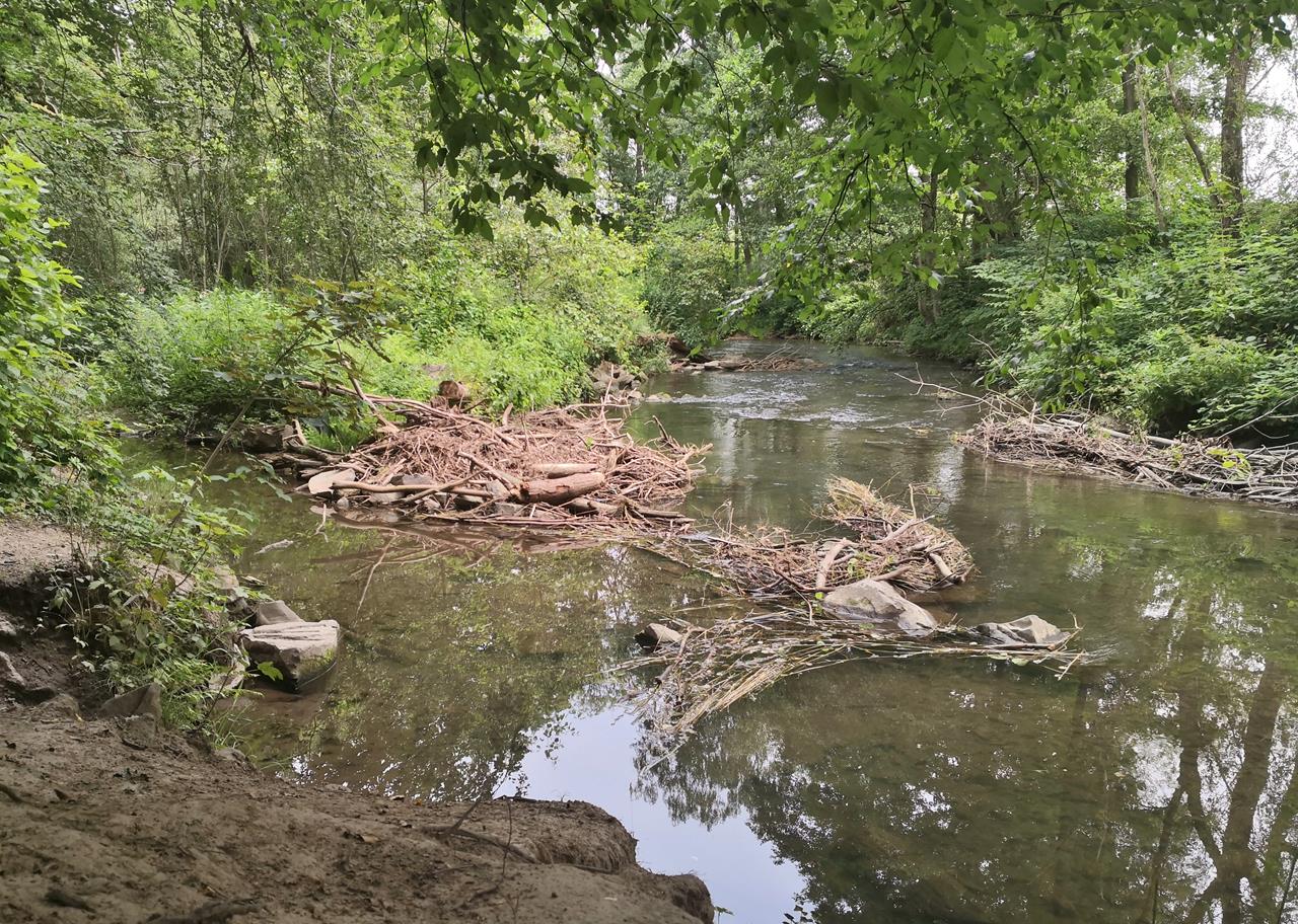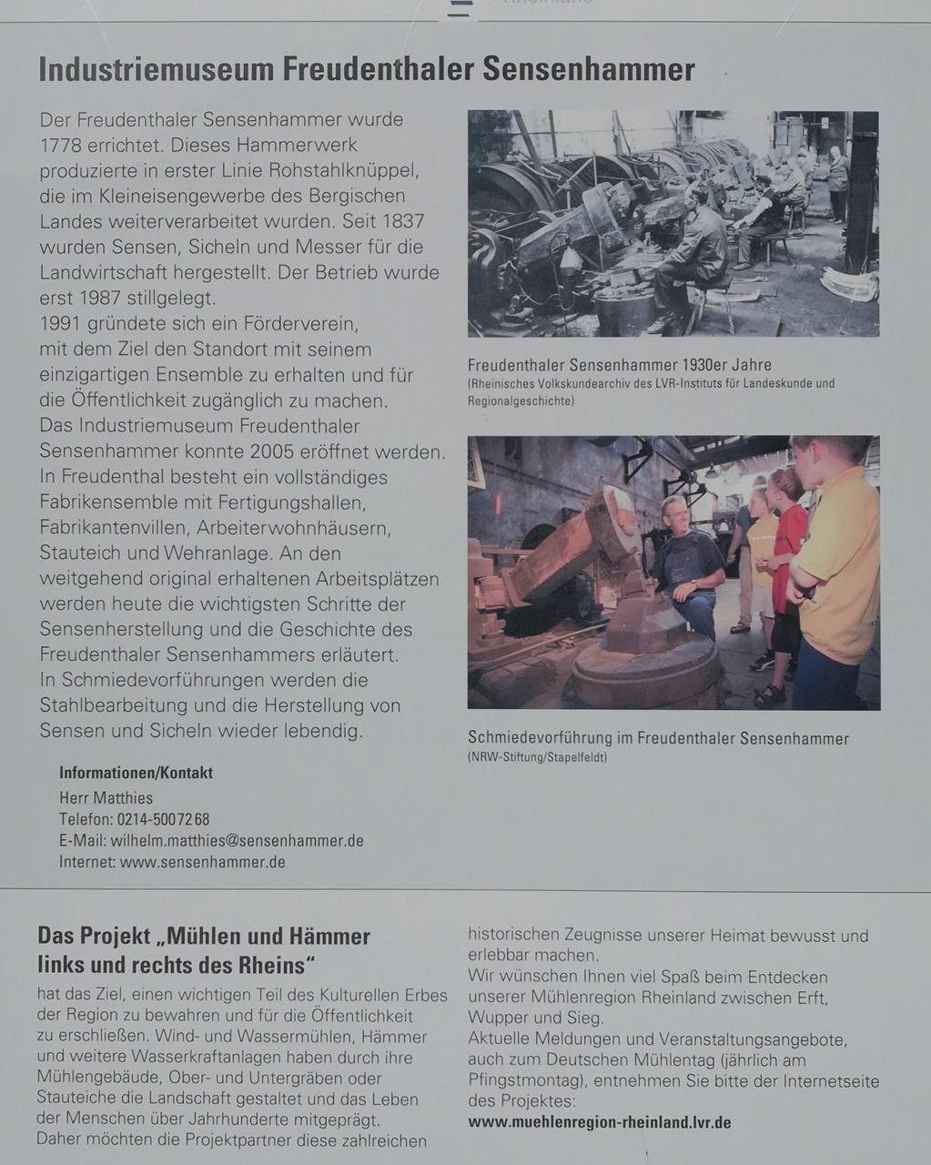 Nach unserem Abstieg vom Uppersberg erreichen wir am ländlich geprägten Ortsteil Hummelsheim den Fluss Dhünn, der aus dem Bergischen kommt und sich in die Wupper ergießt, unmittelbar bevor diese in den Rhein mündet. Der Dhünn folgend passieren wir am Hammerweg das Industriemuseum Freudenthaler Sensenhammer, eine historische Sensenfabrik.