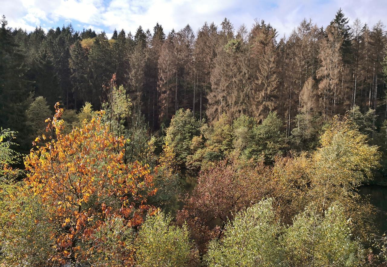 Wir parken am Campingplatz Glüder in unmittelbarer Nähe der Wupper und laufen nach wenigen Schritten in den Wald hinein, der gerade beginnt, sich herbstlich einzufärben. Mit jedem Wanderkilometer geht es ein Stück weiter hinauf auf die Höhen über dem Sengbachtal.Bald erreichen wir die Staumauer der 1903 errichteten Sengbachtalsperre, die zu den ältesten Trinkwasserspeichern in Deutschland gehört. Der zwischen Wäldern gelegene Wasserspeicher unweit der Wupper versorgt die Bewohner der Stadt Solingen mit Trinkwasser.