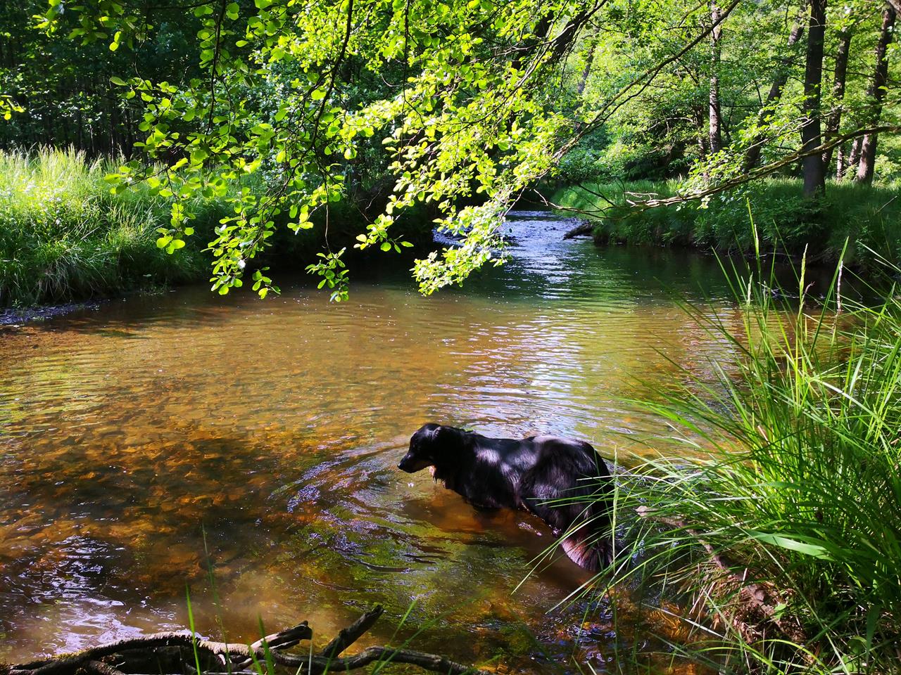 Von Niederkrüchten aus laufe ich mit Doxi rund 10 km am Fluss entlang, die meiste Zeit sehr angenehm im Schatten großer Bäume. Doxi steigt immer wieder in die Schwalm, die hier zwar einige Meter breit, aber derzeit nur 20 bis 40 Zentimeter tief ist.