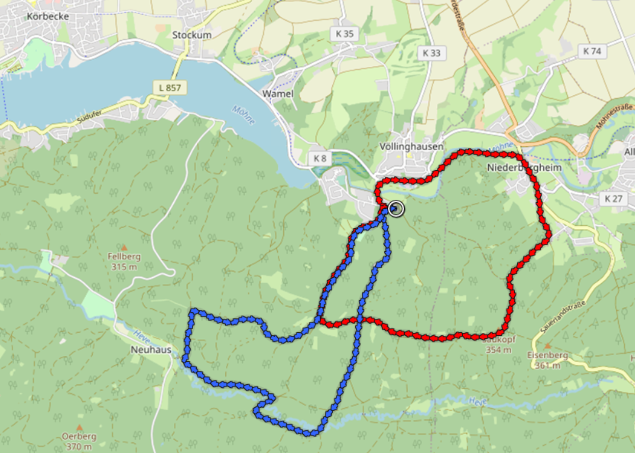 Am nächsten Morgen fahren wir an den Ostrand des Sees in den Ort Völlinghausen. Dort gibt es einen kostenlosen Womo-Stellplatz in der Nähe des Wildgeheges Völlinghausen. Gleich dahinter beginnt der riesengroße Arnsberger Wald. Am Morgen und am Abend laufe ich mit Doxi jeweils rund drei Stunden durch den Wald.