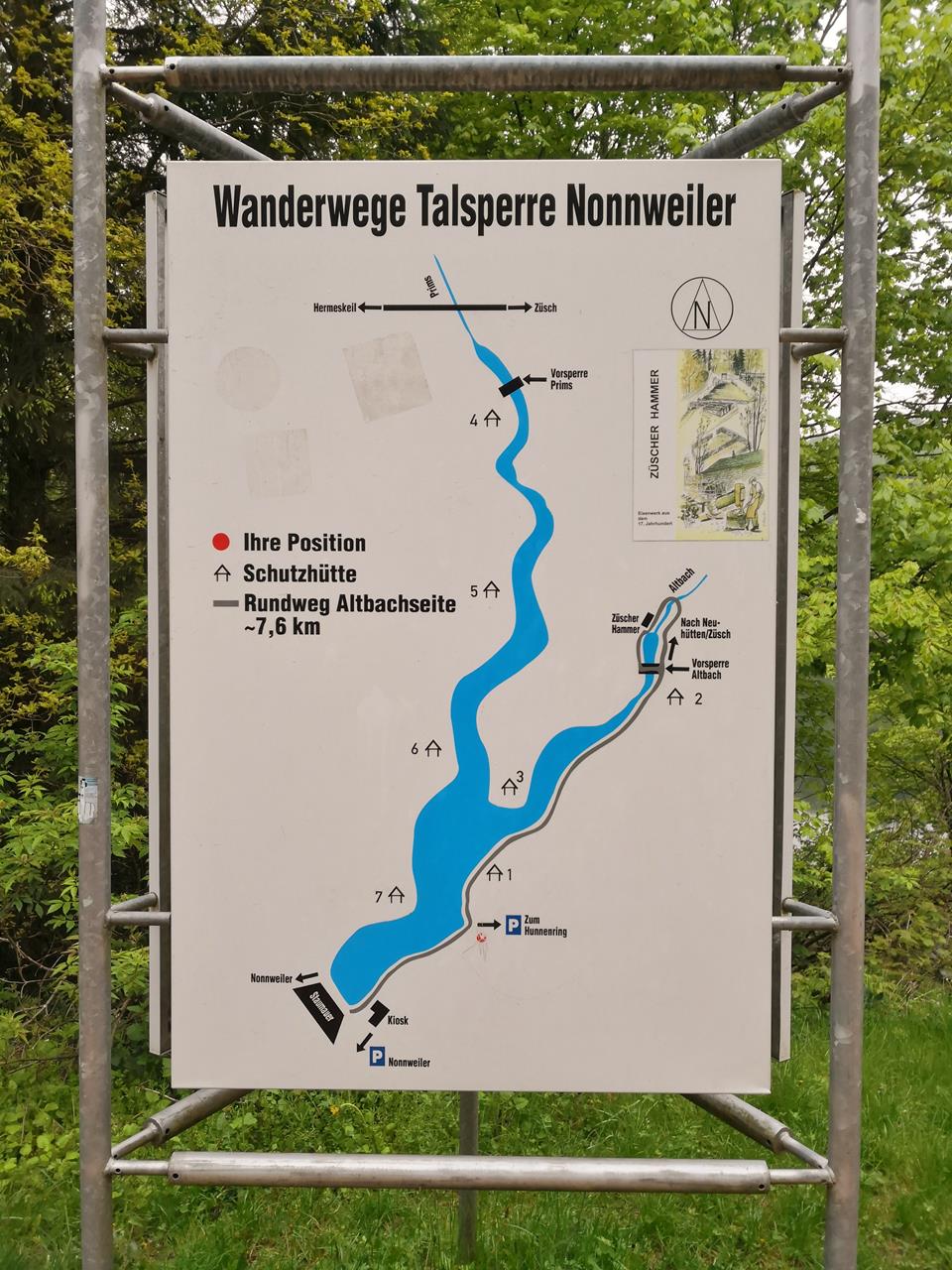 Wahrscheinlich hätte ich mir denken können, dass die rekonstruierte Keltensiedlung aus diversen Holzhäusern und einer Umfriedung aus mächtigen Baumstämmen morgens um 7:30 Uhr noch nicht zugänglich ist. Aber dass der Park erst um 13:00 Uhr öffnet, damit hatte ich nicht gerechnet. Also wandere ich mit Doxi erst einmal zur Talsperre Nonnweiler, die früh am Morgen ganz ruhig da liegt. Das Wetter ist nicht wirklich einladend und irgendwie sind wir Beide – Doxi und ich – nicht richtig motiviert.