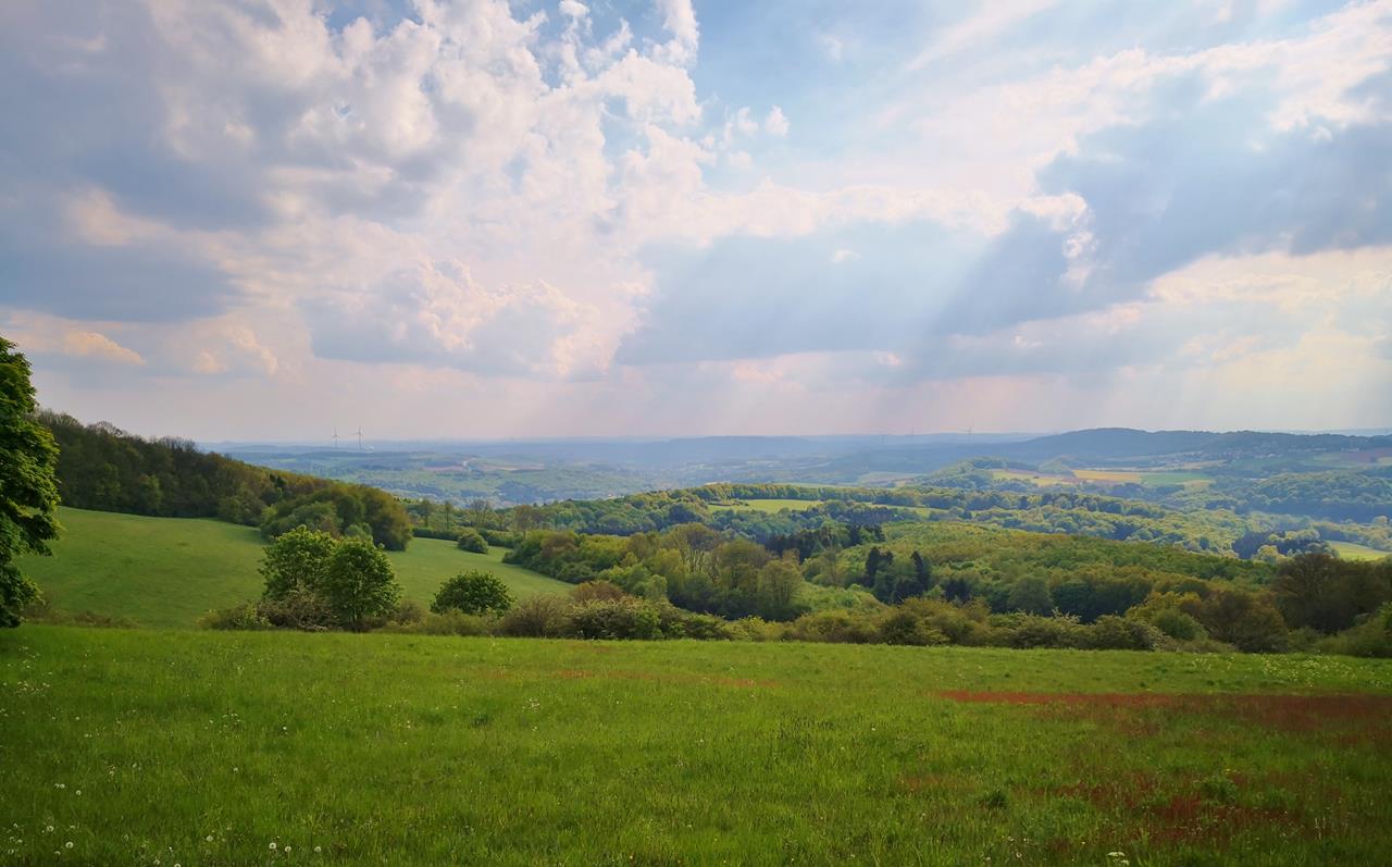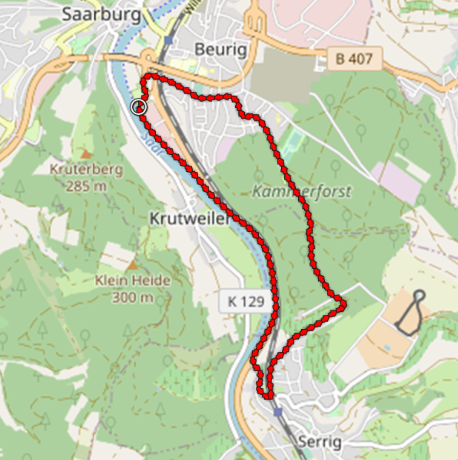 Nach einem Rundgang durch die Altstadt breche ich mit Doxi zu einer 18 km langen Wanderung in südlicher Richtung auf die Höhen oberhalb der Saar auf. Es geht hinauf auf den Kruterberg und anschließend in einer langgezogenen Schleife durch den frisch ergrünten Buchenwald.