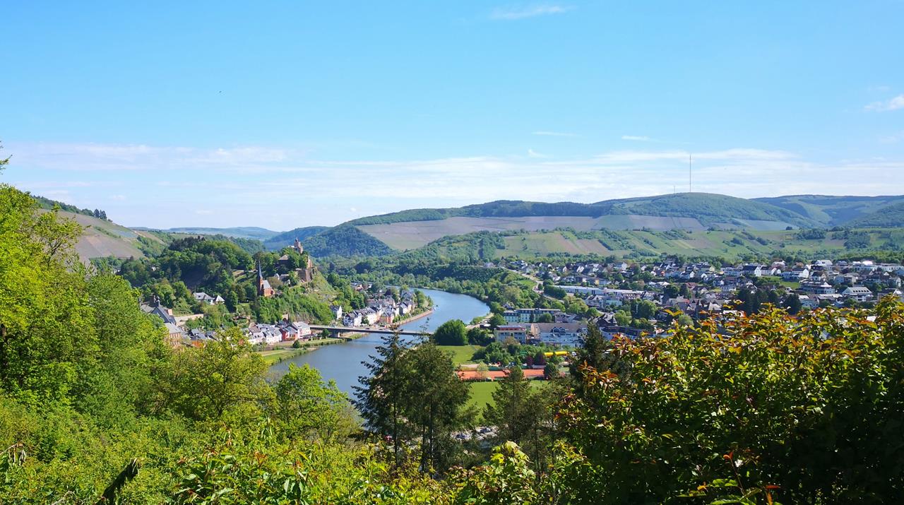 Blick oberhalb von Monzel in das Moseltal mit Bernkastel-Kues am Horizont