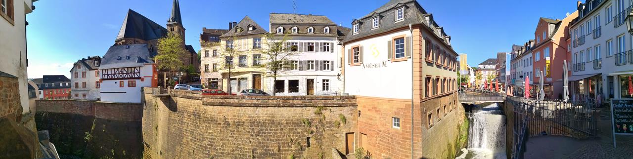 Mit dem Wohnmobil stehen wir auf dem beliebten und immer gut besuchten Womo-Stellplatz direkt an der Saar. Von dort sind es nur etwas mehr als tausend Meter Fußweg bis zur historischen Saarbrücke, die in die Altstadt von Saarburg führt.