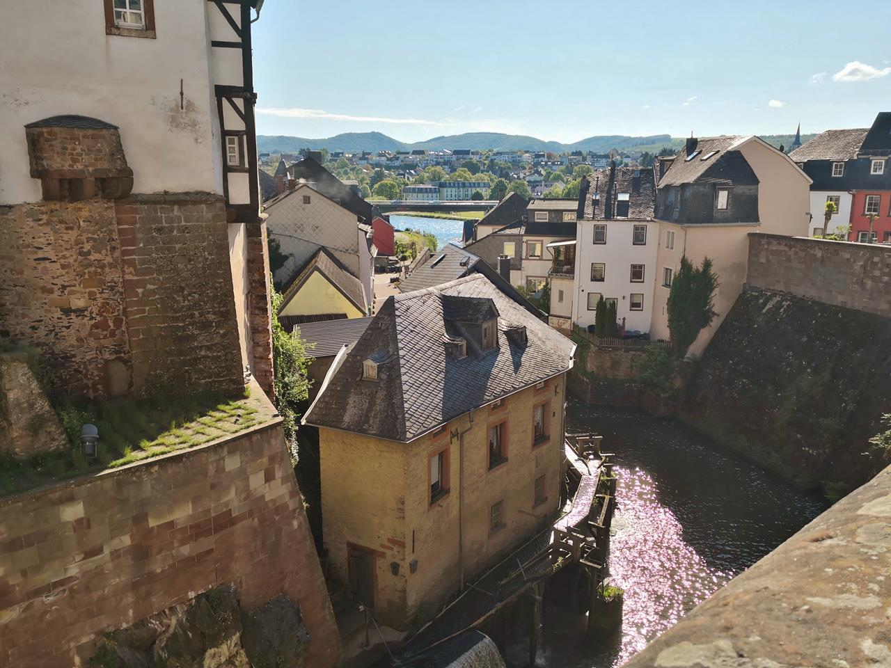 Blick von der Spitze des Bergfrieds der Saarburg zur Altstadt.