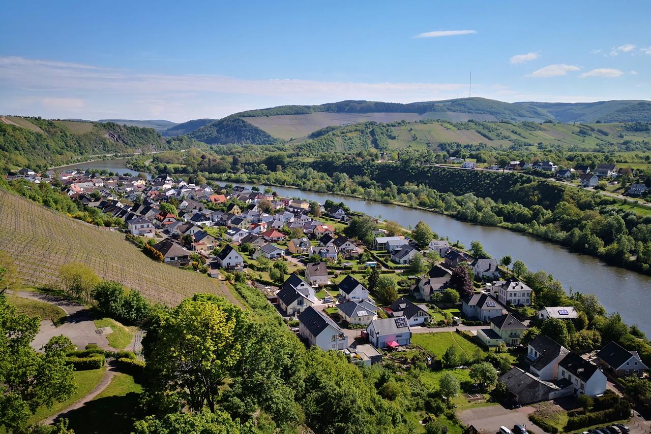 Blick hinunter auf Piesport (rechts). Davor am gegenüberliegenden Moselufer: Alt-Piesport.