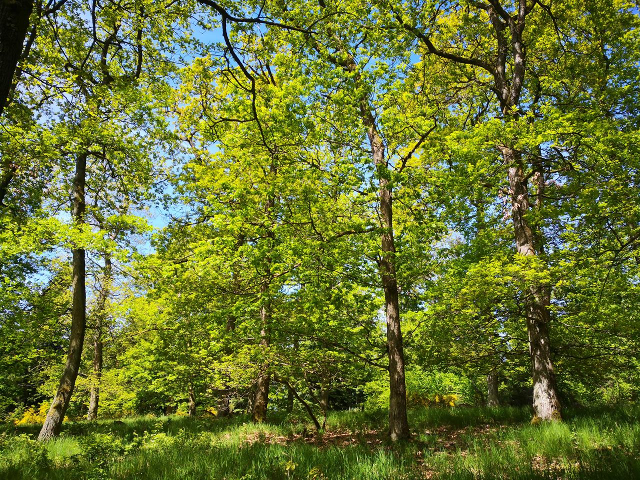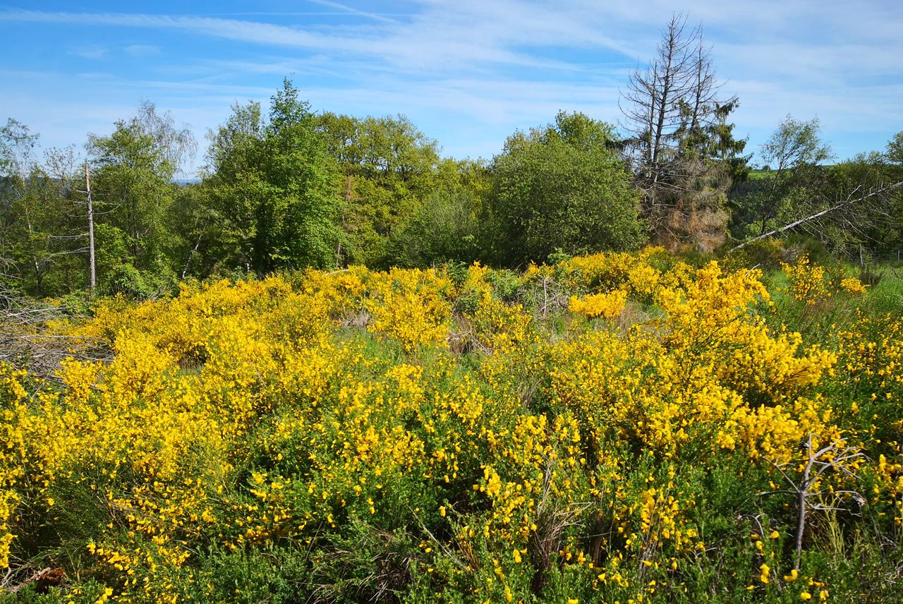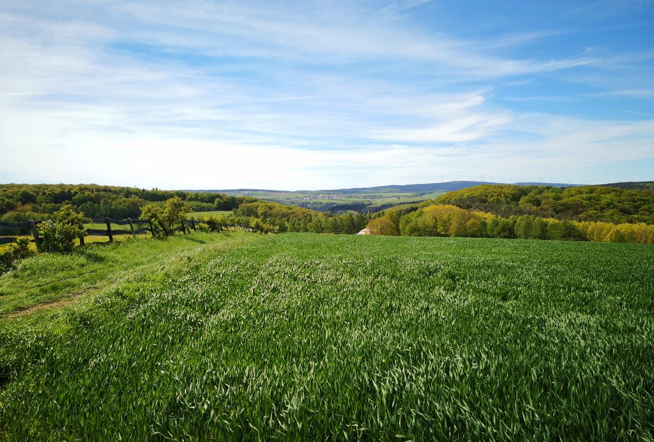 Nach einer kurzen Waldpassage stellen sich unvermittelt wunderbare Fernblicke in den Hunsrück ein. Zwischen grünen Kornfeldern und gelben Rapsflächen erscheint am Horizont der Ort Longkamp.
