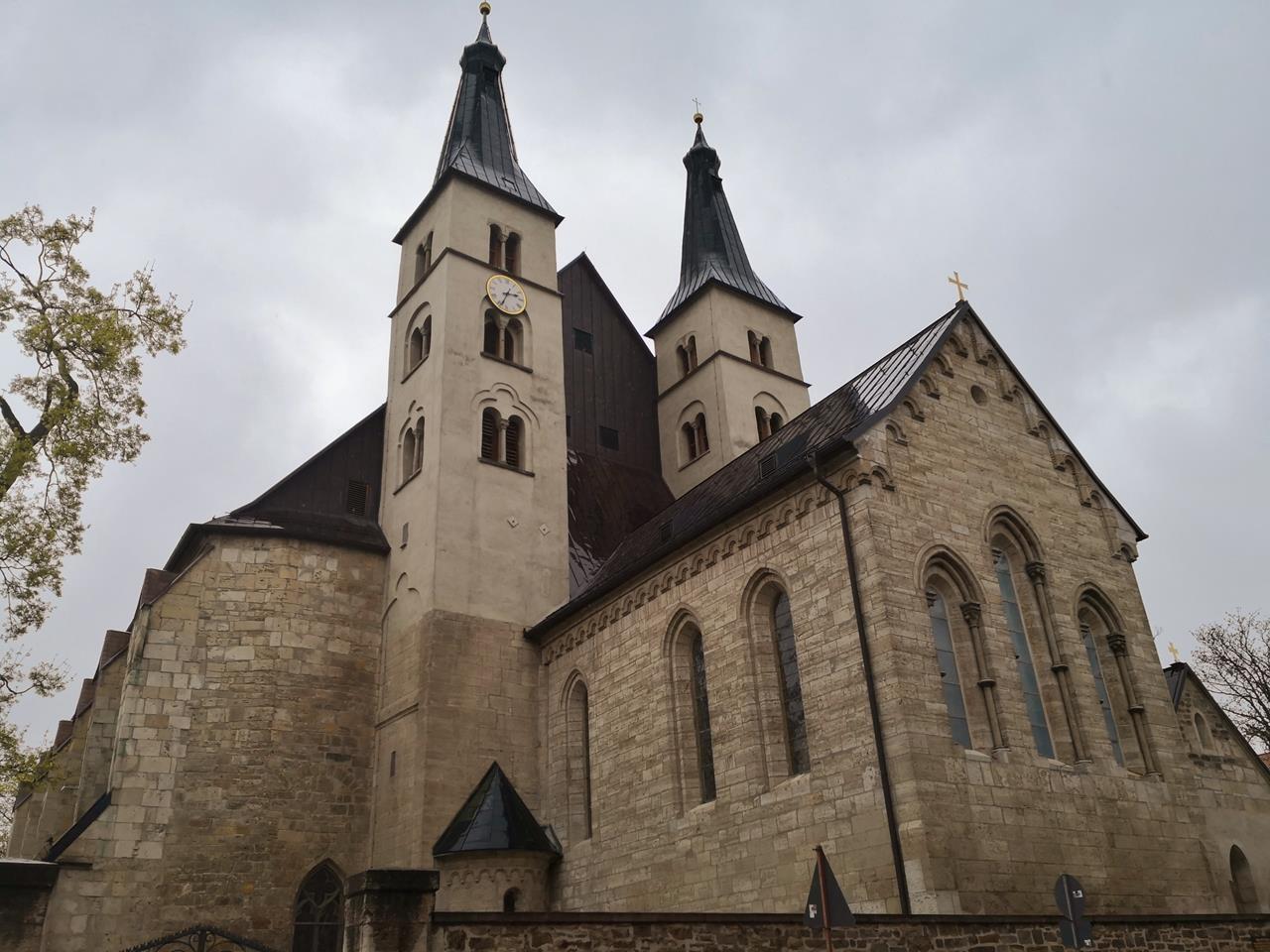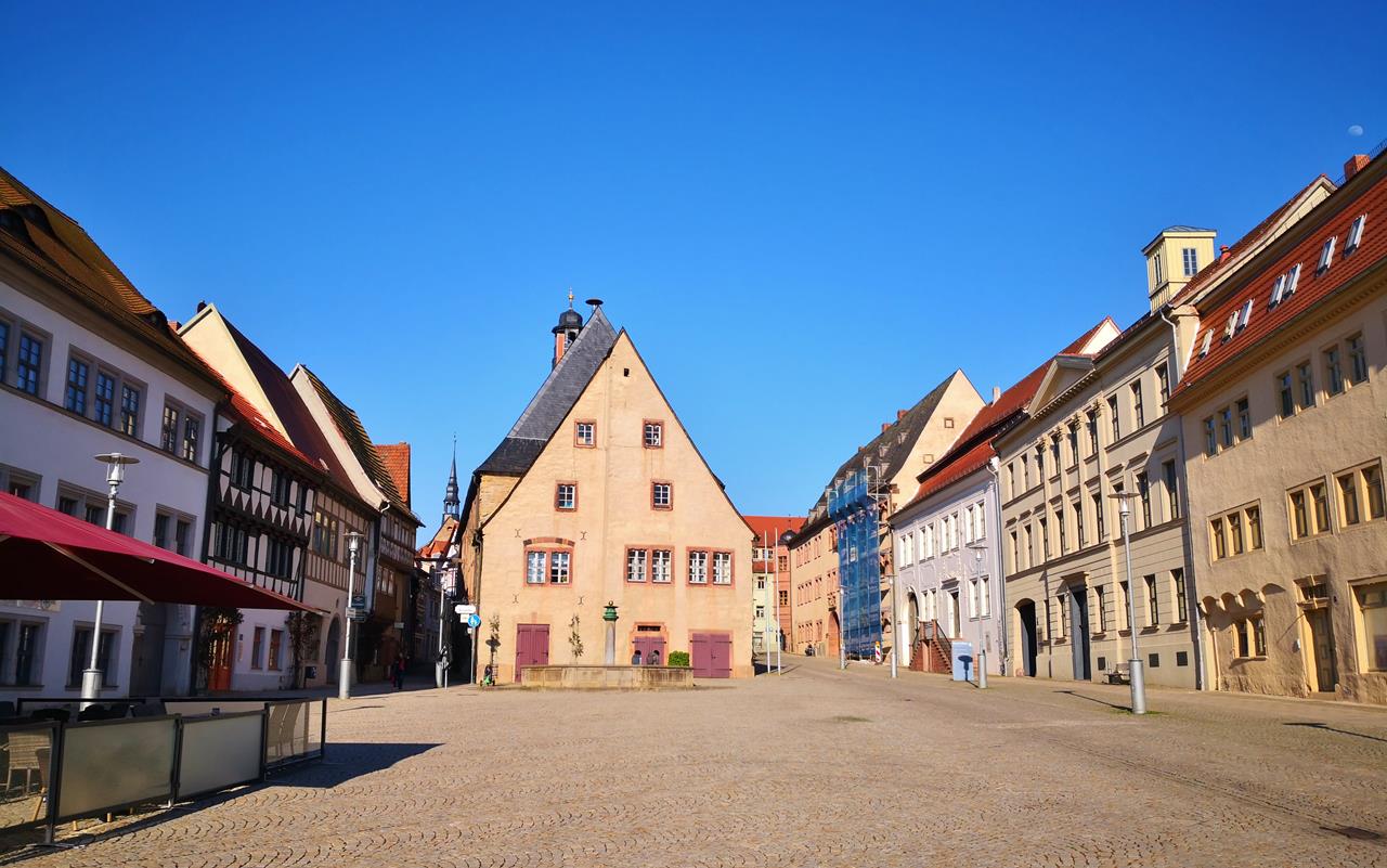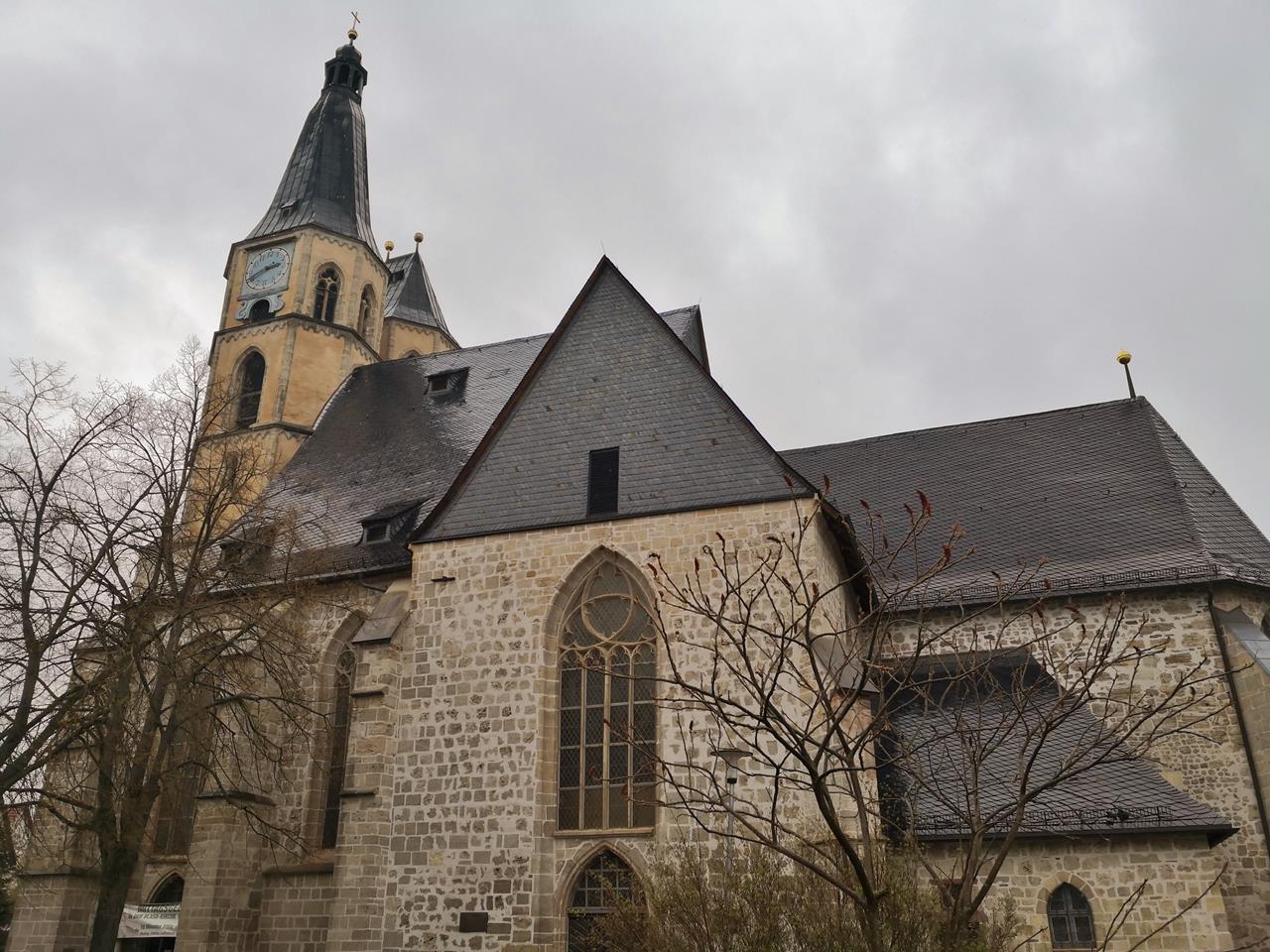 Blick auf die gotische Hallenkirche St. Jakobi am Marktplatz von Sangerhausen mit dem Turm „der schiefe Jakob“