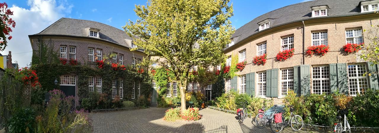 Entlang des schnurgeraden Nierskanals wandern wir mehrere Kilometer an zahllosen Gartenbaubetrieben vorbei in Richtung des Dorfes Veert. Dann drehen wir Richtung Walbeck ab und laufen durch eine uralte Allee mit schönen Bäumen an der Grift entlang, einem Reststück der ehemaligen Fossa Eugenia.