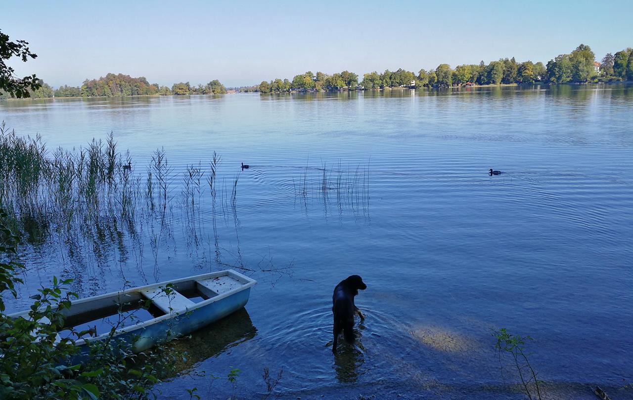 In Herrsching laufen wir bis zum schönen Kurpark an der Uferpromenade des Ammersees. Dort legen wir eine kleine Pause ein. Doxi lässt es sich natürlich nicht nehmen, währenddessen die Wasserqualität des Sees zu testen.