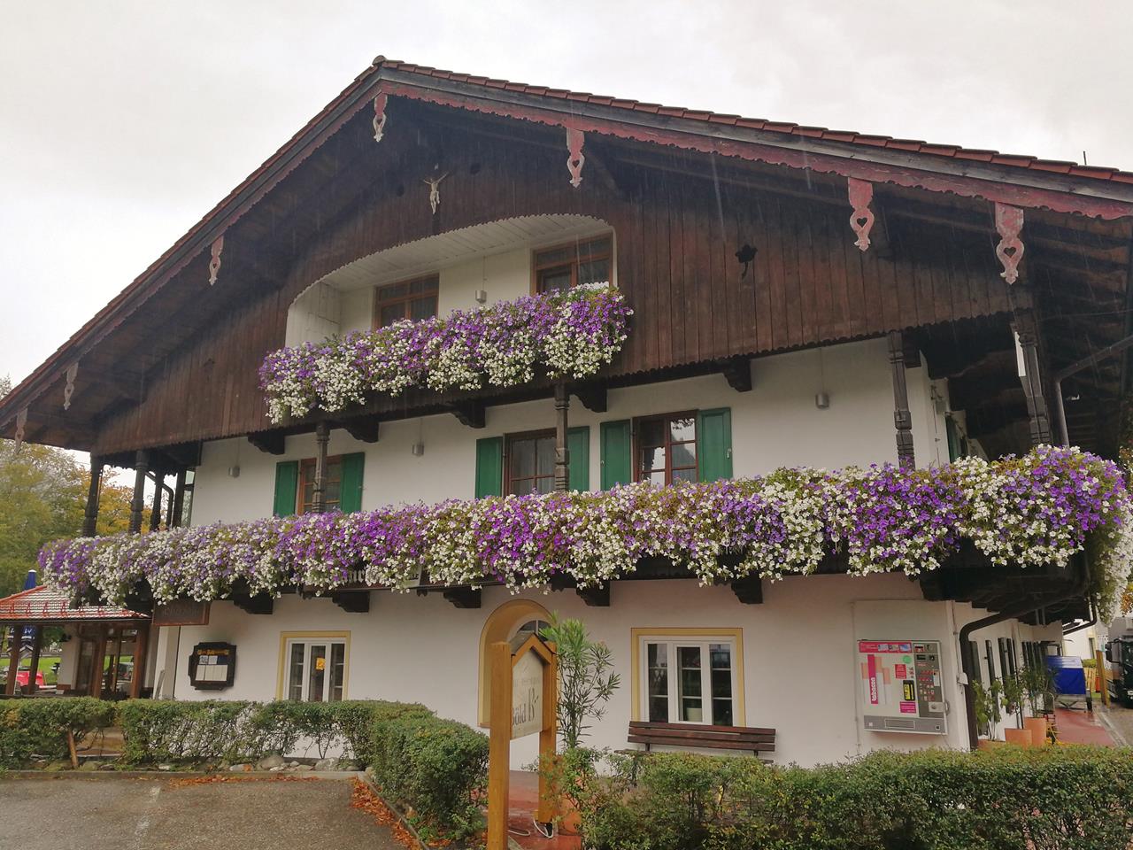Oberammergau ist ein beliebtes Touristenziel und zieht deshalb auch viele Wohnmobilfahrer an. Überall sieht man Schilder, die das Übernachten auf den ausreichend vorhandenen Parkplätzen im Ort untersagen. Also stellen wir uns ganz brav auf den einzigen autorisierten Übernachtungsplatz am südlichen Ortsrand gleich neben dem Festplatz.