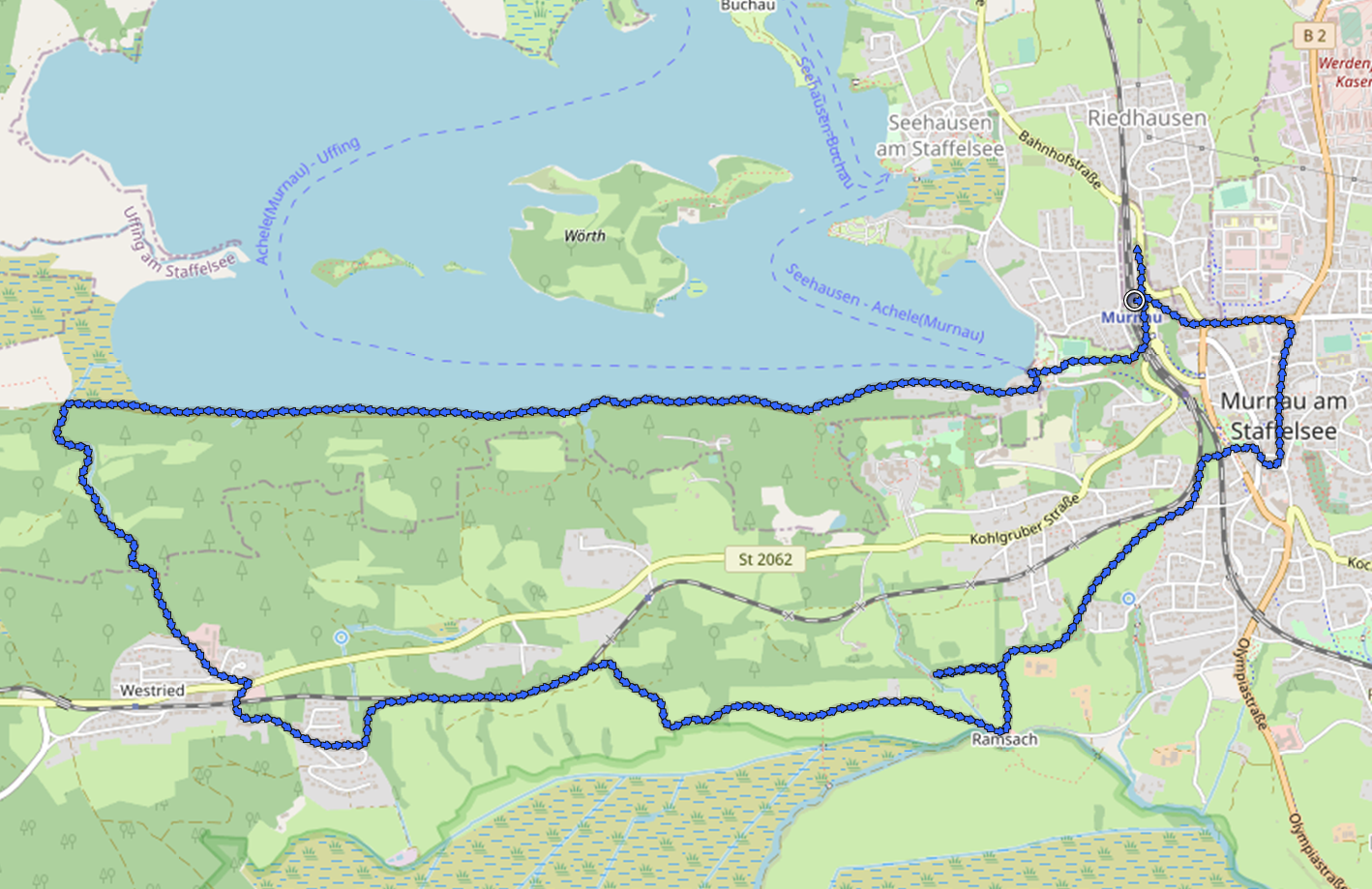Wir laufen zunächst fast fünf Kilometer auf dem Seerundweg am Südufer des Sees entlang. Neben uns ragt ein bewaldeter Molassezug steil bergauf. Am Westufer des Sees erreichen wir die Verlandungszone am Obernacher Moos. Hier drehen wir nach Süden ab und überqueren den Molassezug, bis wir dahinter auf die Eisenbahnlinie nach Murnau treffen. Dort öffnet sich der Blick ins Murnauer Moos und dem dahinter aufragenden Gebirge: links das Estergebirge, in der Mitte das Wettersteingebirge und rechts das Ammergebirge.