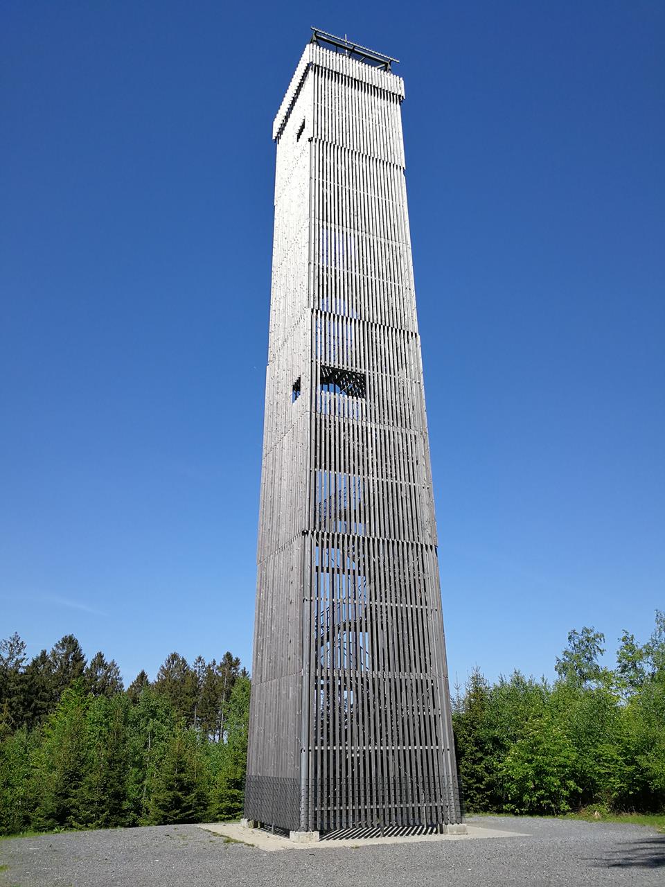 Bei dieser Witterung hat man oben auf dem Turm in 40 Meter Höhe einen fantastischen Fernblick über den Möhnesee, den Arnsberger Wald und die angrenzenden Gemeinden. Heute sind sogar die Kraftwerkstürme bei Hamm in der norddeutschen Tiefebene nördlich des Haarstrangs ganz deutlich zu erkennen. Toll ist das.