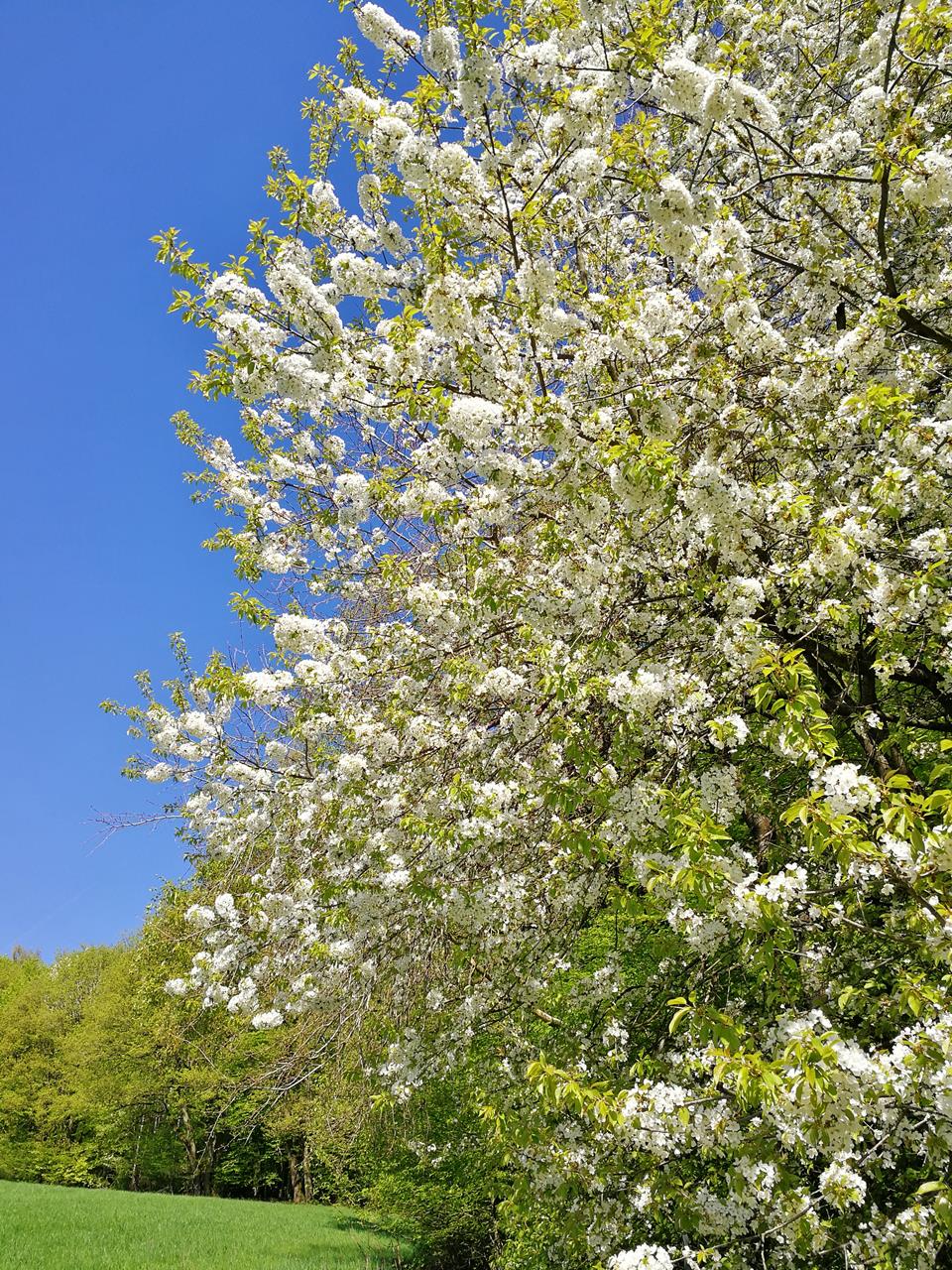 Blühender Obstbaum am Waldrand