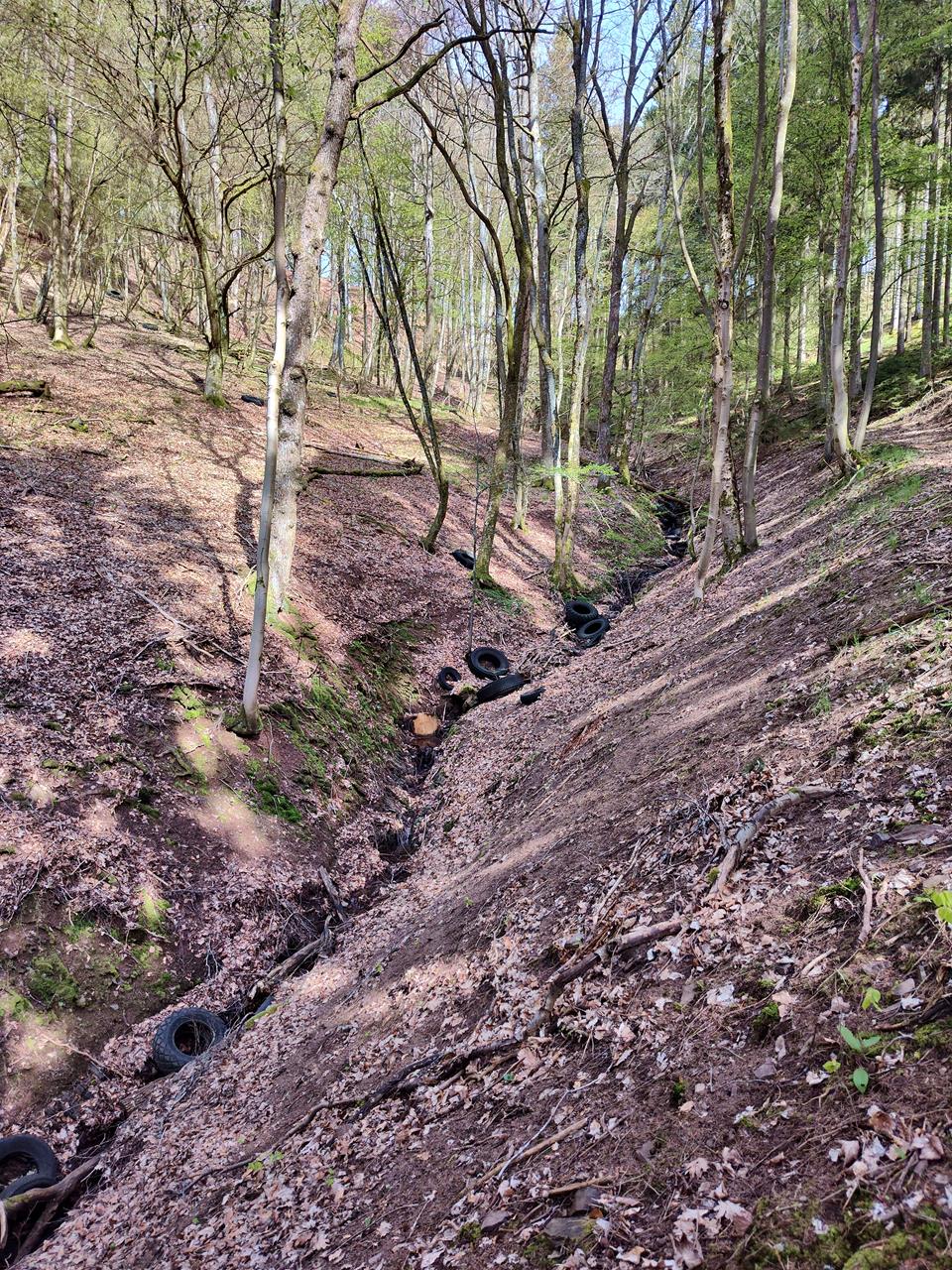 In einem kleinen Bachtal zwischen Olef im Talgrund und Hohenfried auf den Höhen bin ich auf geschätzt drei Dutzend illegal entsorgte Autoreifen gestoßen.Die Reifen liegen überall, teilweise im Bach, teilweise auf den Hängen. Von der Größe her sind nach meinem Eindruck nur wenige PKW-Reifen dabei.