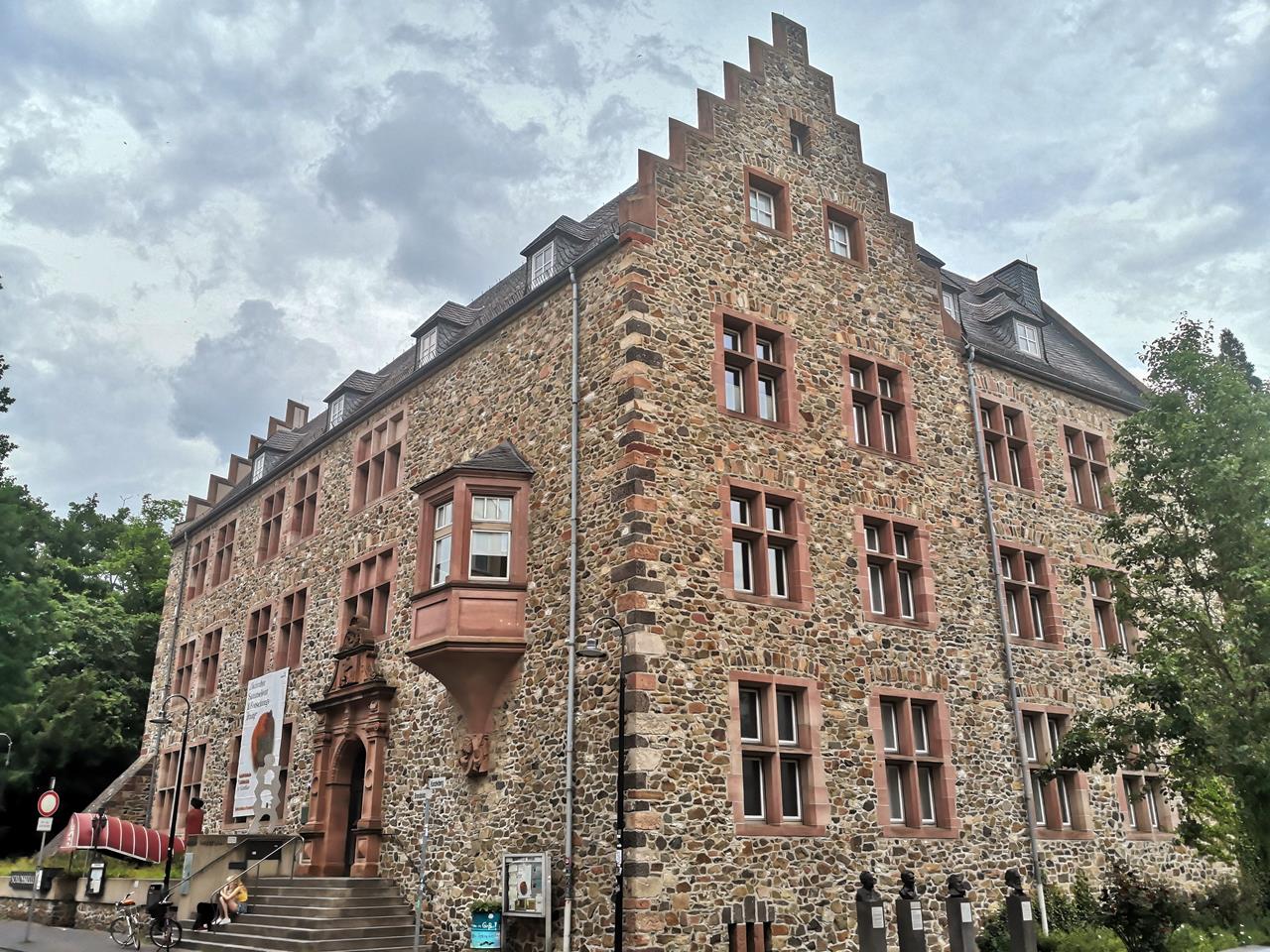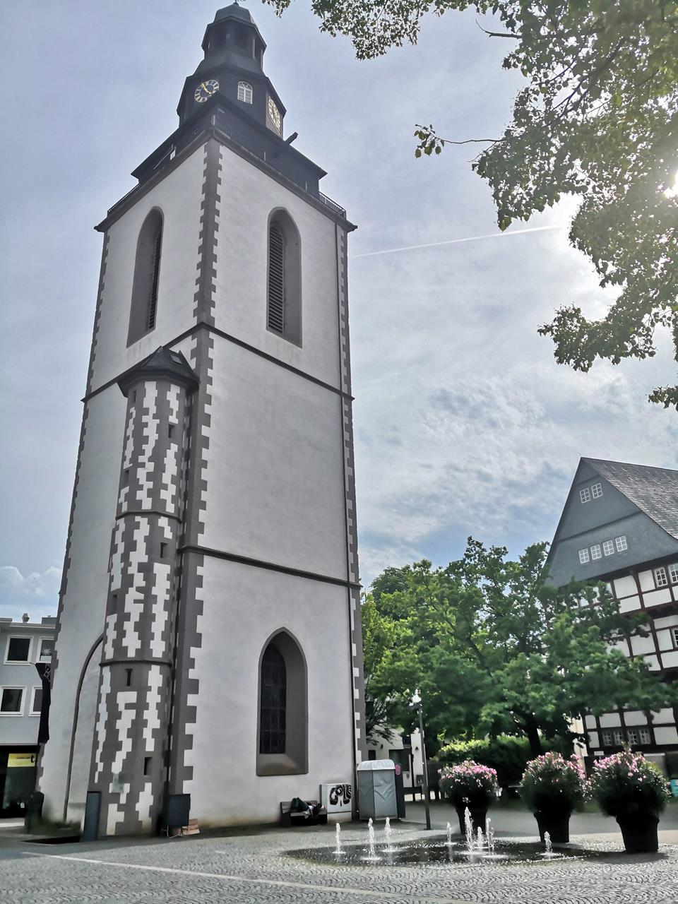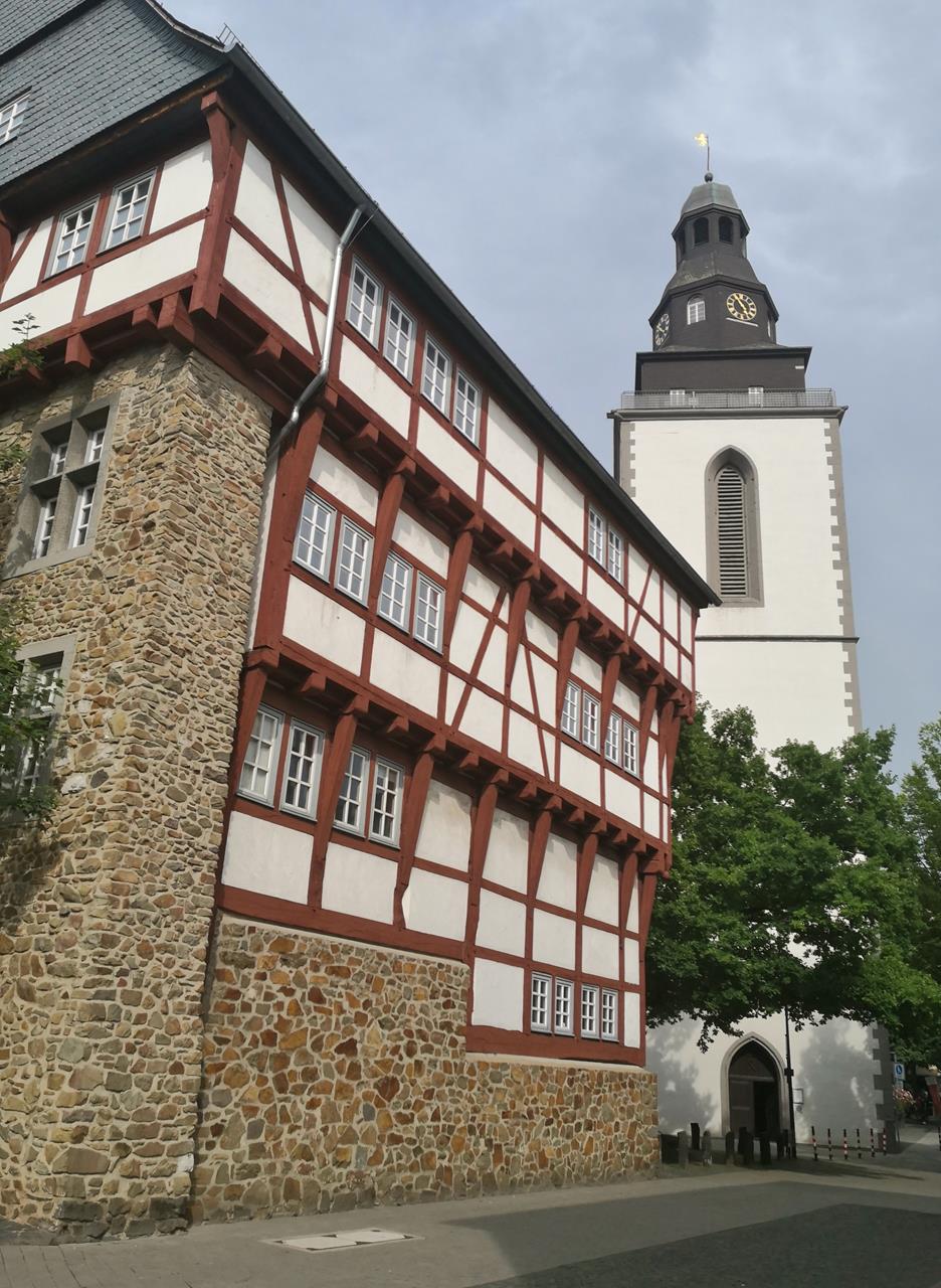Mittags ist ein Gewitter-Sturmtief bei uns durchs Rheinland gezogen, gegen 19 Uhr soll es von Südwesten kommend Mittelhessen erreichen. Ich muss mich auf meiner Stadterkundung mit Doxi deshalb ein wenig ranhalten.Als wir von unserem Stellplatz am Freibad ins Zentrum der Stadt laufen, bin ich zunächst ein wenig ernüchtert: Historische Bausubstanz entdecke ich nur ganz vereinzelt.