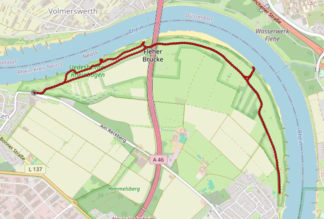 Als ich heute Morgen mit Doxi von Neuss-Grimlinghausen nach Uedesheim laufe, ist der Rheinstrand an den meisten Stellen bereits überflutet, genau wie die vorgelagerten Kiesbänke.Vielerorts reicht das Wasser schon bis an die erste Baumreihe heran, sodass man nur noch an wenigen Stellen direkt bis an den Fluss herankommt.