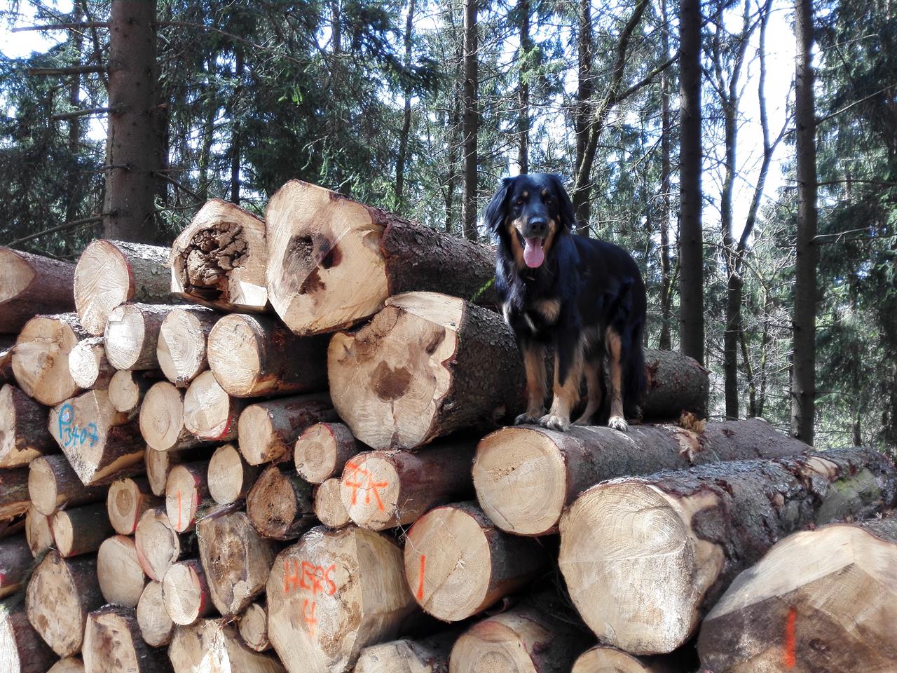 Ich habe nur mal kurz „Hopp“ gesagt, schon ist Doxi rauf auf den Baumstapel