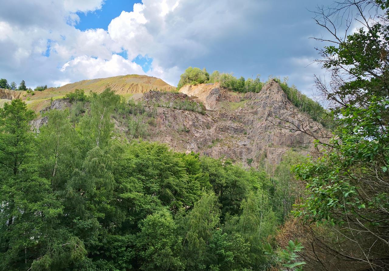 Auf dem Philosophenweg wandern wir schließlich zurück in Richtung Bad Harzburg und blicken dabei in den großen Gabbro-Steinbruch, der eine massive Bergflanke offengelegt hat. Unter ohrenbetäubendem Getöse werden die großen Steinbrocken zermahlen und anschließend auf riesige Kipplaster verfüllt.