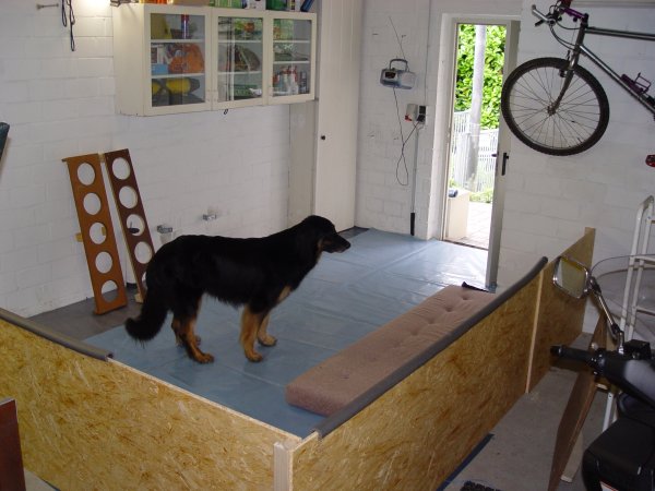 Wir haben in der Garage einen großzügigen Bereich abgetrennt, in dem wir später auch die Wurfkiste unterbringen werden. Der Boden wird mit Folie ausgelegt. Darauf kommt Papier, damit wir den Bereich schnell säubern können, wie bereits jetzt im erweiterten Welpenauslauf.