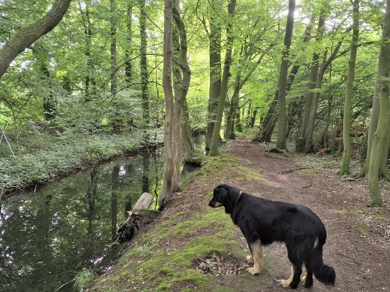 Umlaufender Wassergraben um den Park. Doxi fragt sich: Soll ich in das schwarze Geschlumpe steigen?