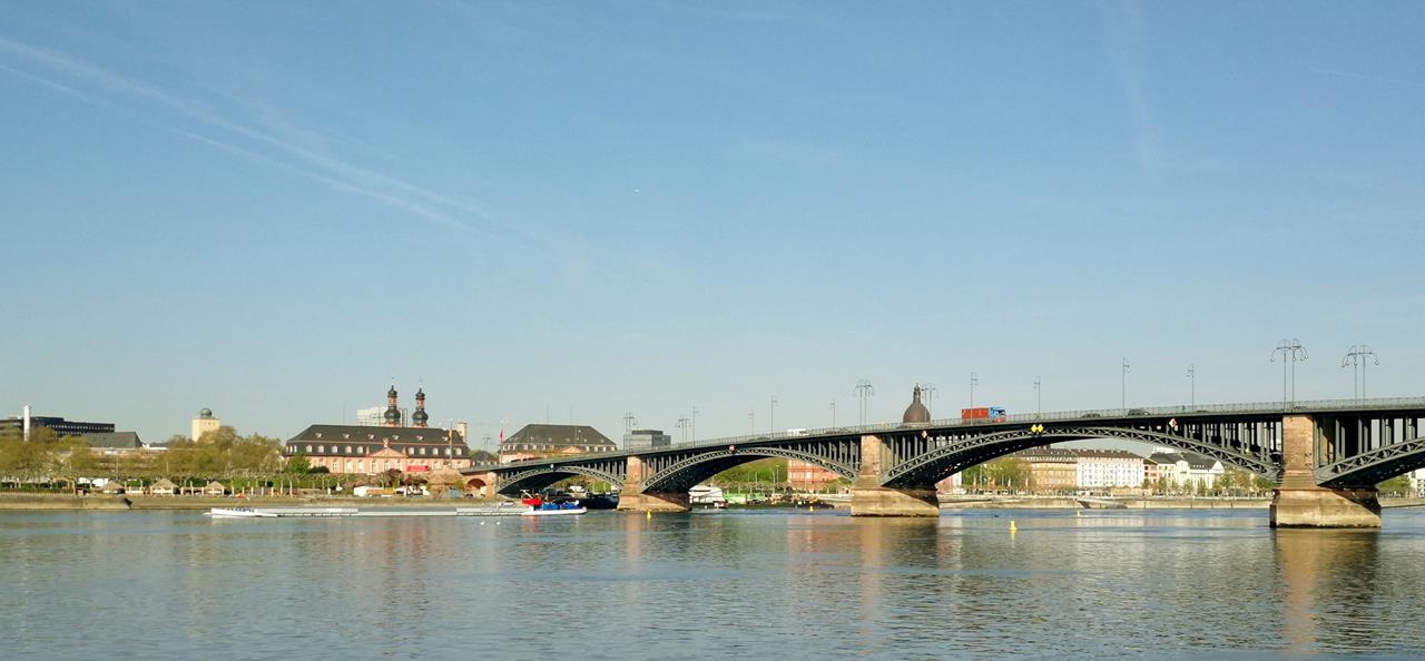 Über die Kostheimer Brücke wechselten wir bald auf die andere Mainseite und liefen dann durch den Burgpark wieder auf die Mainmündung zu. Direkt daneben befindet sich die große Eisenbahnbrücke (Südbrücke), über die auch Fahrradfahrer und Fußgänger auf die andere Flussseite nach Mainz wechseln können.