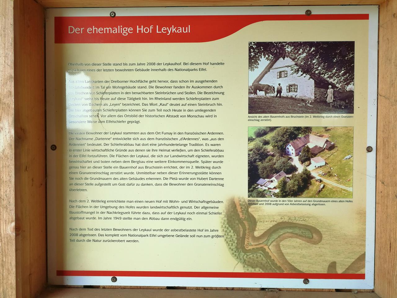 Auf einer Infotafel an dem verlassene Gehöft Leykaul erfahre ich, woher der Familienname „Dardenne“ stammt, der einem hier in der Region so oft begegnet: Es sind die Nachfahren von Schiefer-Brechern, die einst aus den Ardennen eingewandert sind, nachdem sich der Schieferabbau in ihrer Heimatregion nicht mehr lohnte. Es waren die Menschen aus den Ardennen: D’Ardenne.