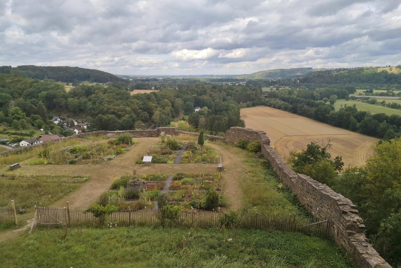 Oben vom Burgberg genießen wir den schönen Fernblick über das Siegtal in Richtung Westen. Am Talende ist deutlich die Siegburg zu erkennen, die der Stadt Siegburg ihren Namen verliehen hat und diese überragt.