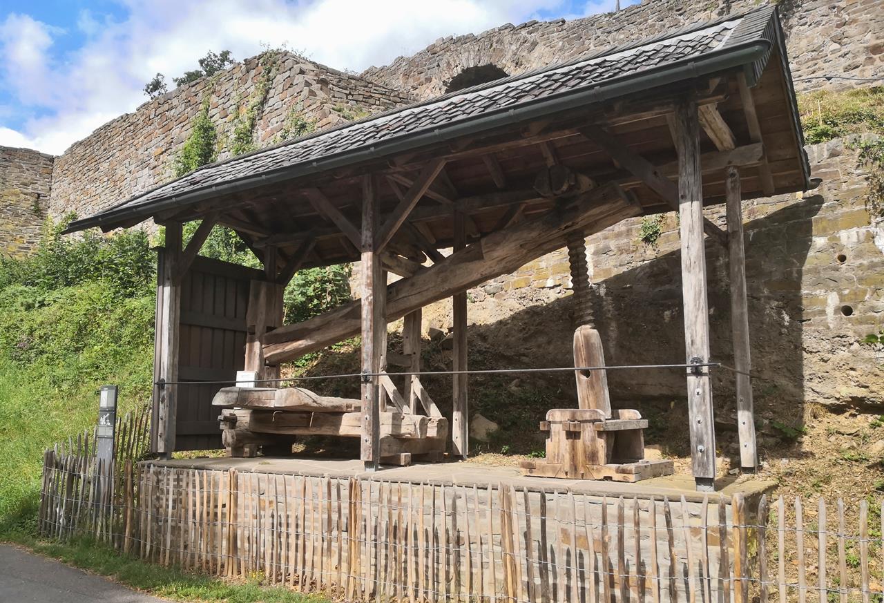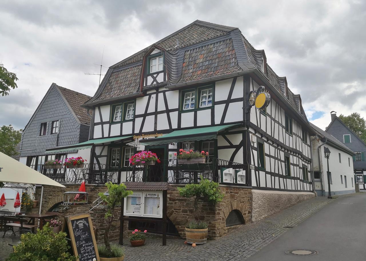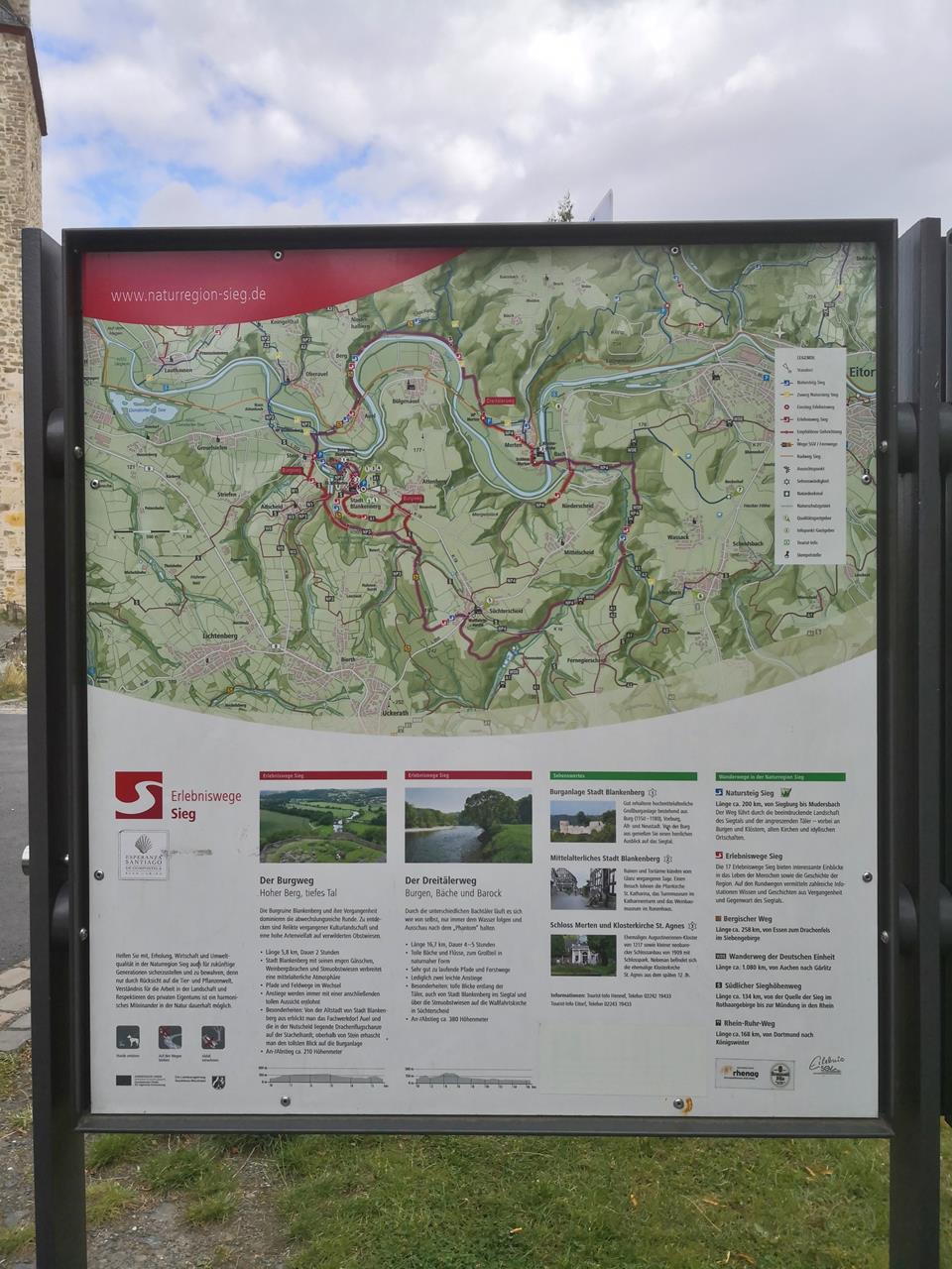 Mein Wandernavi weist uns den Weg zur Tour, die sich dadurch auf 21 km verlängert. Und wir kommen ordentlich ins Schwitzen, denn die Sonne steht hoch am Himmel und zunächst ist ein Anstieg hinauf zur Burg Blankenberg mit dem angeschlossenen historischen Ortskern zu bewältigen.