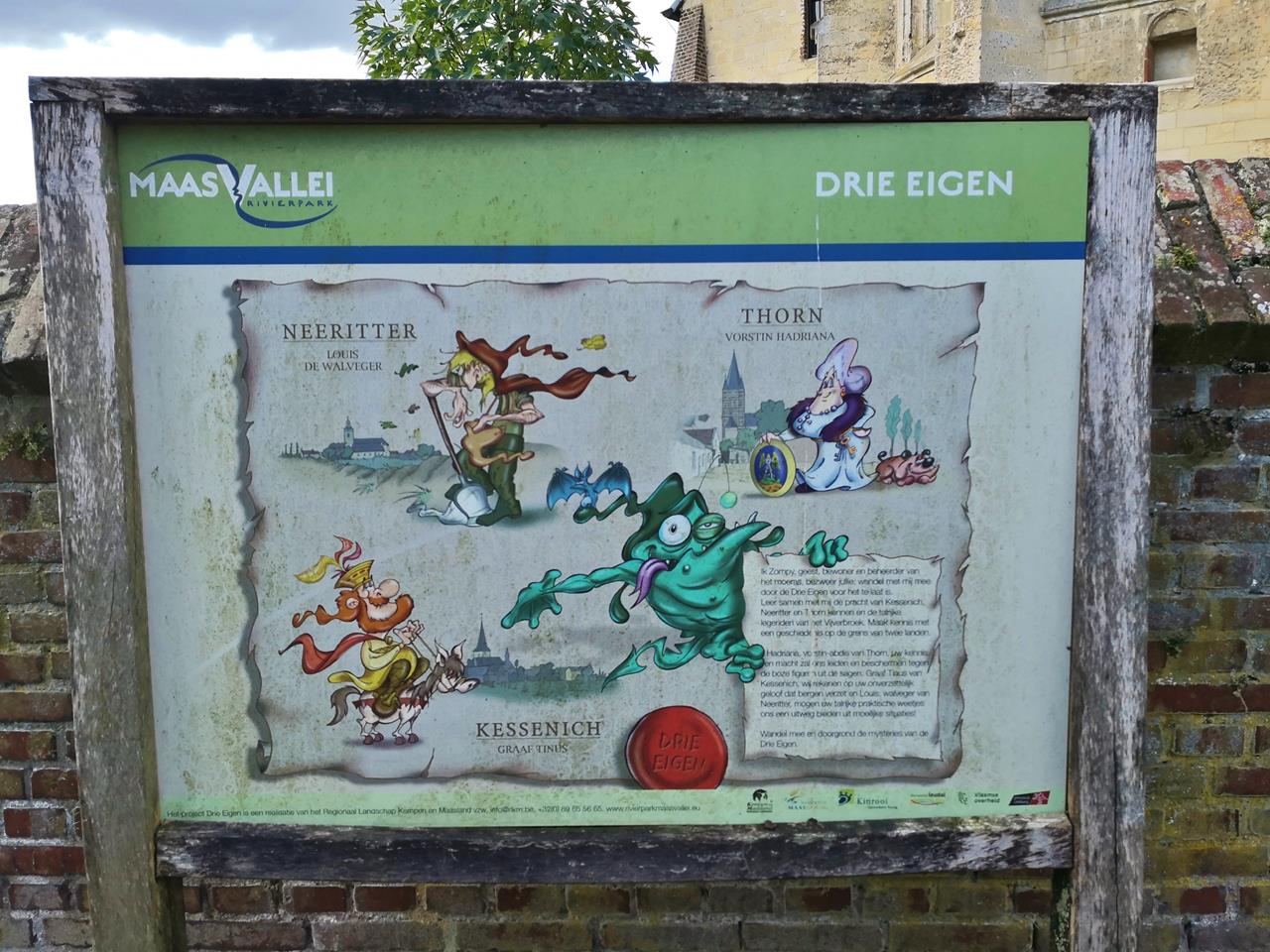 Doch seit 1842 trennt eine Landesgrenze die Drie Eigen: Thorn und Neeritter liegen seitdem in den Niederlanden, Kessenich in Belgien.Aber abgesehen von den markanten niederländischen Grenzsteinen nimmt man die Übergänge kaum wahr: Sprache, Baustil, Verkehrsschilder und die Liebe zu allem Frittiertem ähneln sich sehr, nur die Autokennzeichen nicht.