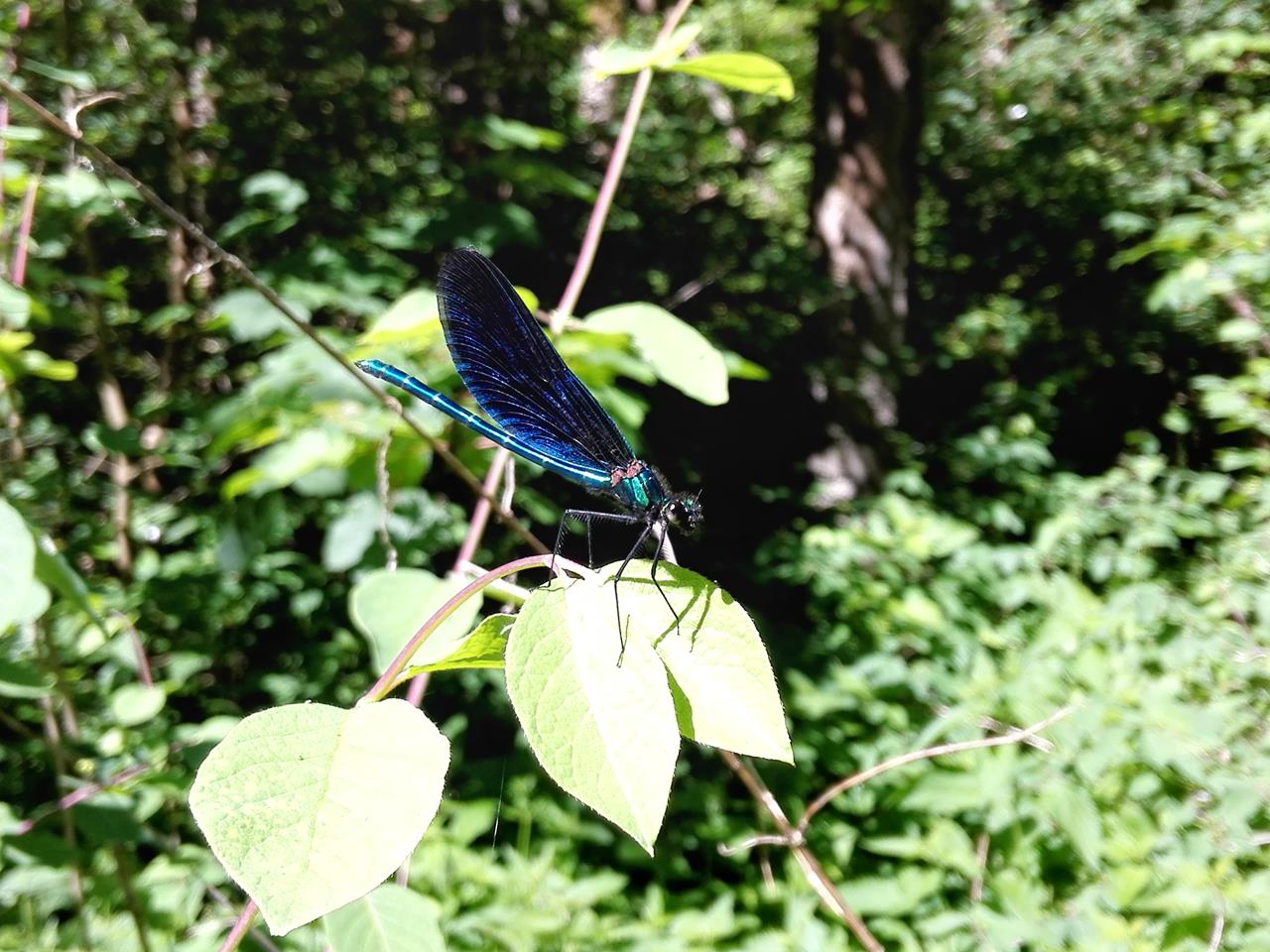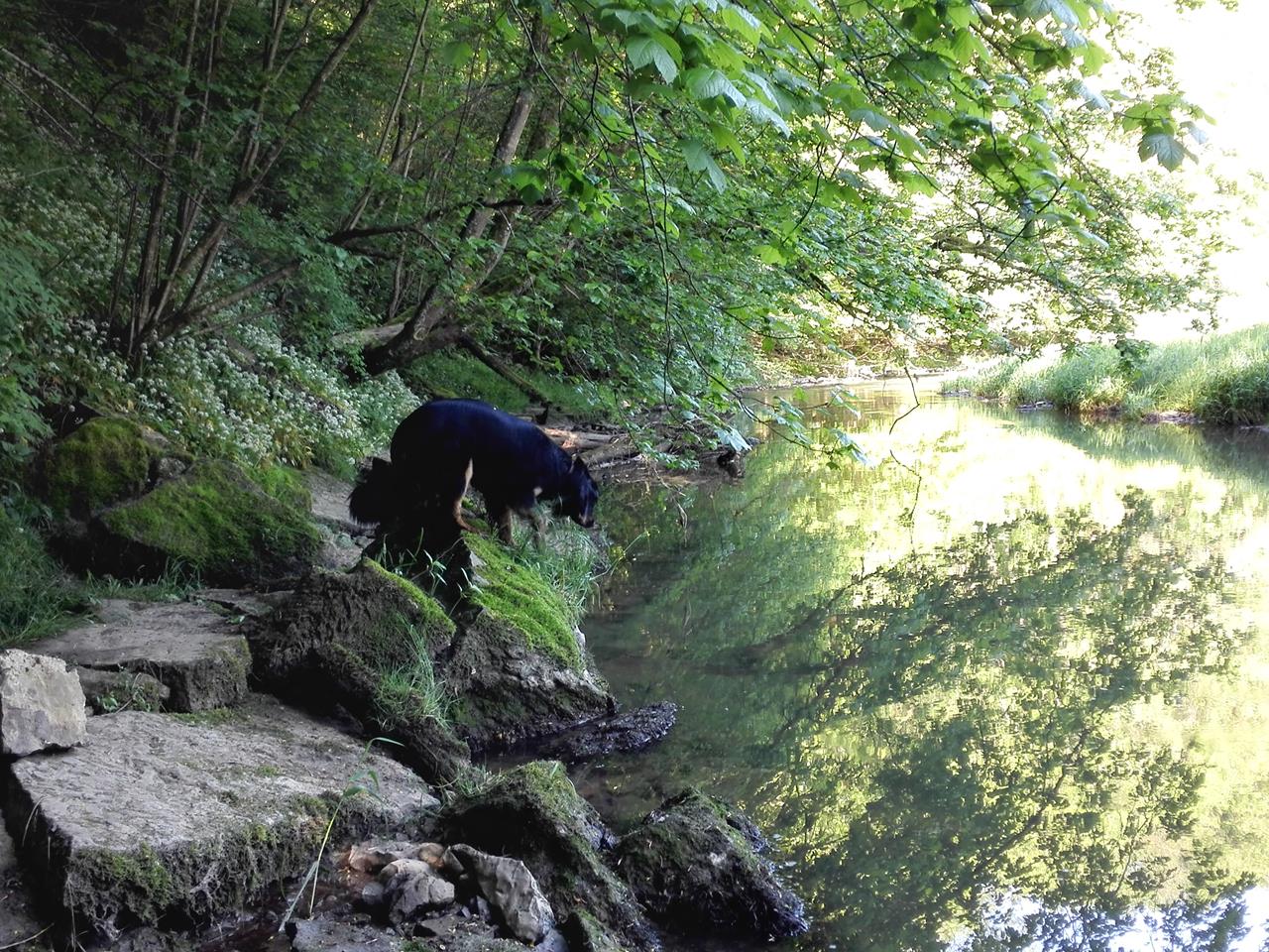 An einer Stelle geht es nur über eine steile Leiter hinauf auf einen Felsvorsprung weiter. Ich habe Glück, dass ich Doxi motivieren kann, den Steilhang mit Anlauf mehrere Meter hochzusprinten, denn die Leiter kann sie nicht nehmen.Am Ufer sind viele Schmetterlinge und Libellen unterwegs. Mit ein wenig Glück gelingt es mir, eine blau schimmernde Libelle zu fotografieren. Links und rechts vom Wasser blüht der Bärlauch. Es riecht entsprechend intensiv.