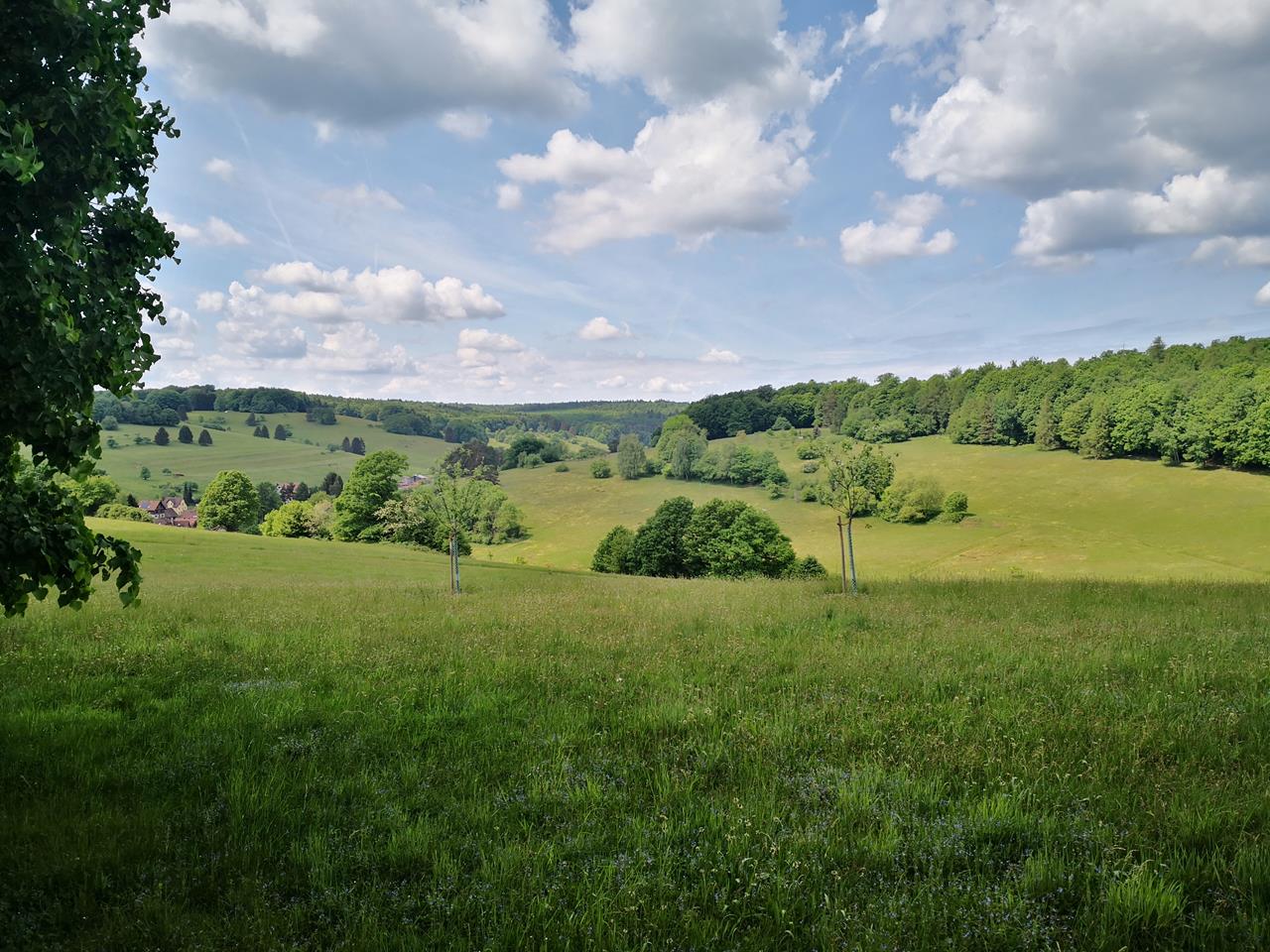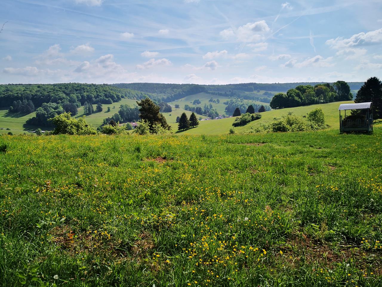 Wer gerne allein im Wald unterwegs ist, kommt rund um Rothenbuch voll auf seine Kosten. Außer einem Schäfer und seiner Herde begegnen wir auf unserer fünfstündigen 20 km-Wanderung tatsächlich niemandem.Vom Wohnmobil-Stellplatz am Ortsrand bei den Sportanlagen steigen wir zunächst zum Tiergartenberg auf und genießen von dort den Blick auf die Wälder und Wiesen rund um Rothenbuch.