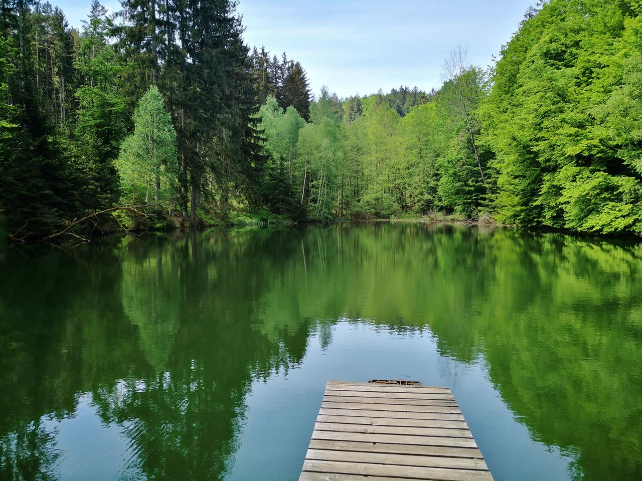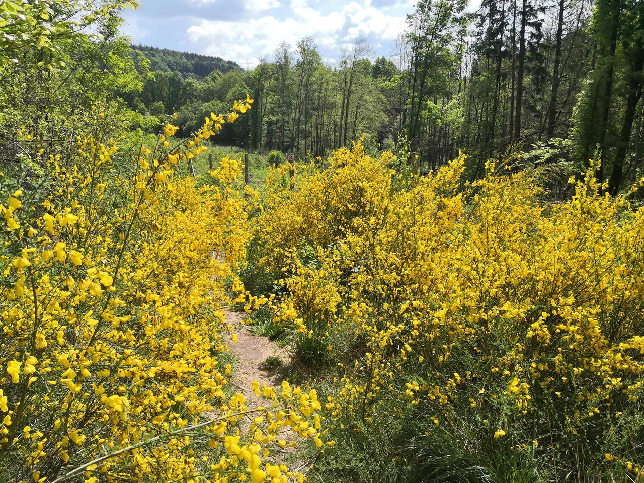 Dann geht es stetig bergauf durch den Wald, bis wir die Bundesstraße 26 am „Sieben Weg“ kreuzen. Auf einem dieser sieben Wege laufen wir anschließend hinab zum verwunschenen Kaltengrundsee mitten im Wald.