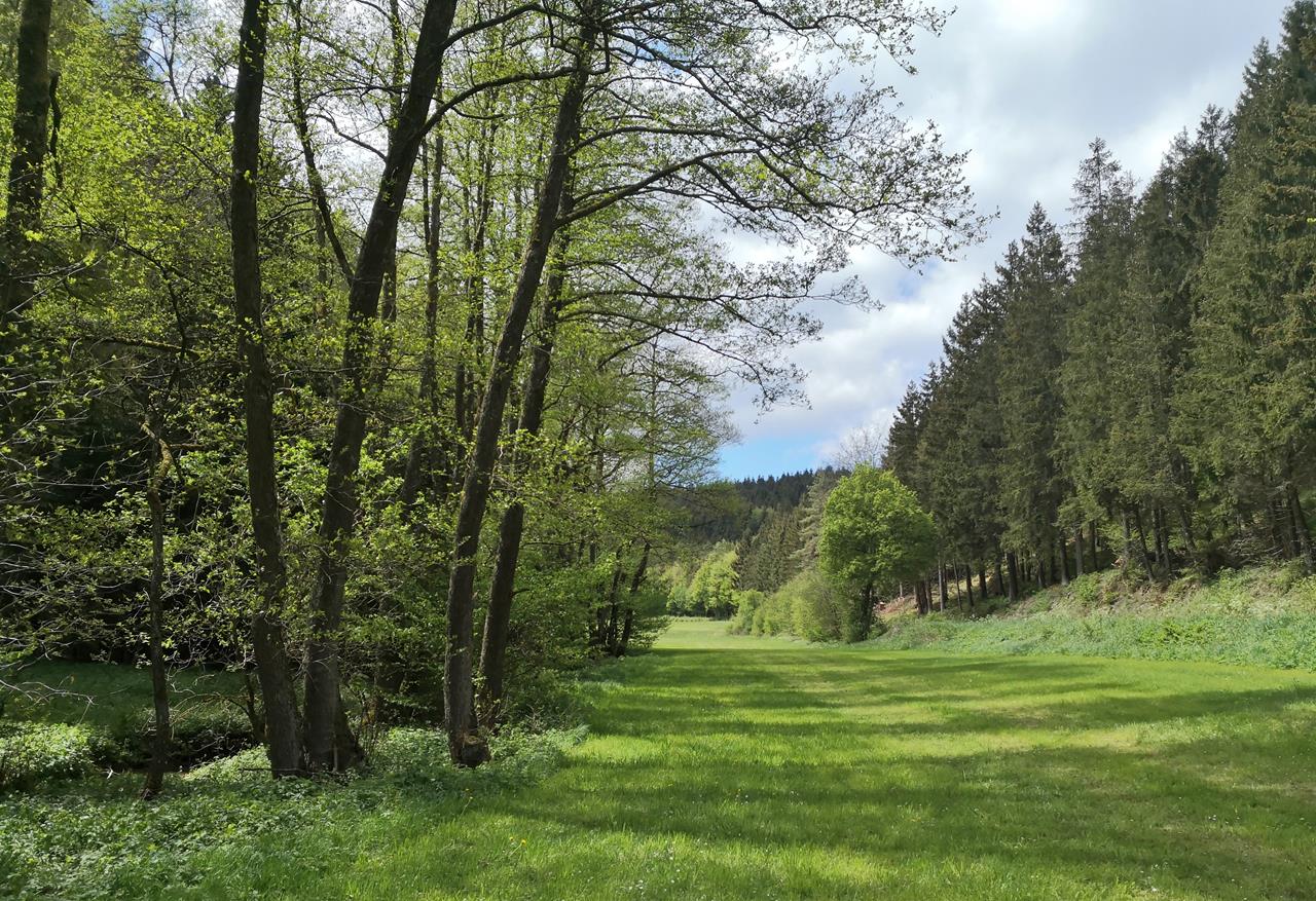 Wir folgen dem Mühlgraben an der Urfter Mühle vorbei bis zum Beginn des Kuttenbachtals. Durch das romantische und naturbelassene Tal gelangen wir zum Ort Rinnen, wobei wir in der Ferne das Kloster Steinfeld erkennen können.