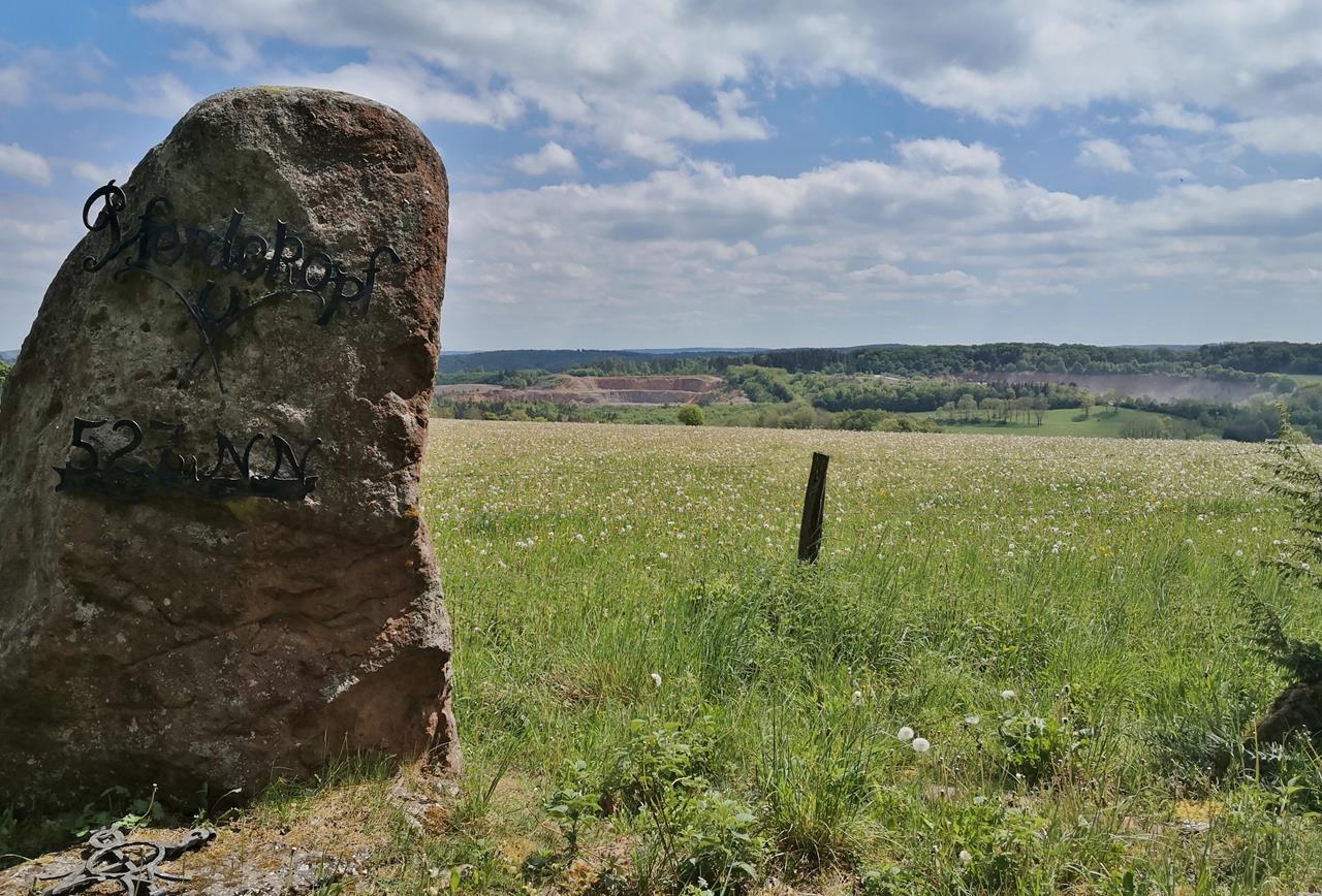 Durch Rinnen steigen wir zum Aussichtspunkt am Pferdekopf auf, wo wir einen tollen Blick in Richtung der Stolzenburg genießen. Von dieser Seite aus sind die Bergaufschlüsse in den großen Steinbrüchen zwischen der Stolzenburg und Rinnen deutlich zu erkennen.