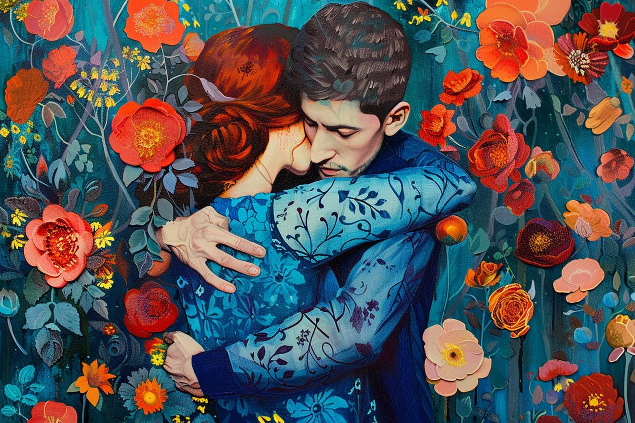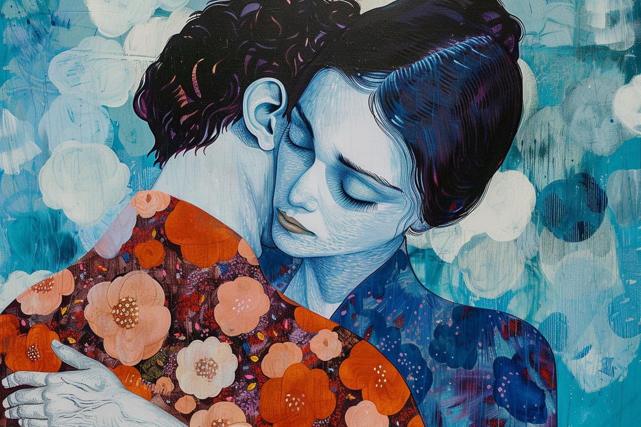 Neu aus der KI auf meiner Festplatte: Frisch imaginierte Kunstwerke in der Art von Erik Madigan Heck (*1983) anlässlich meines persönlichen World Hug Day 2024.