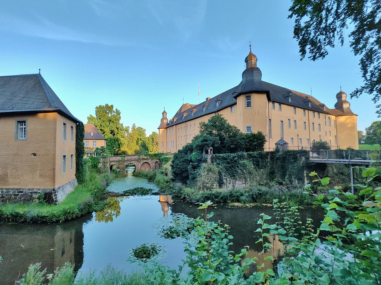 Jetzt war ich endlich auch einmal im Sommer auf Schloss Dyck. Heike und ich sind kurz vor dem Einlassschluss um 18:00 hineingeschlüpft und haben dann einen wunderbaren Abend im fast menschenleeren Park genossen. Denn wenn man einmal drin ist, kann man so lange bleiben, wie man möchte.