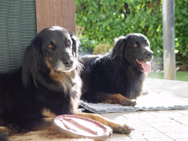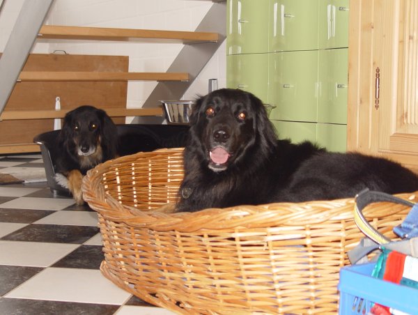 Bloxi findet es natürlich nicht so toll, ihr Revier ungefragt mit einem ausgewachsenen Rüden zu teilen. Weil Alwin ein ganz Lieber ist, hat er sich von Bloxis Geknurre und Gebelle zunächst ein wenig einschüchtern lassen, aber nach einer halben Stunde war die Lage geklärt, und Bloxi hat sich in das Unvermeidliche gefügt. Muss auch so sein.